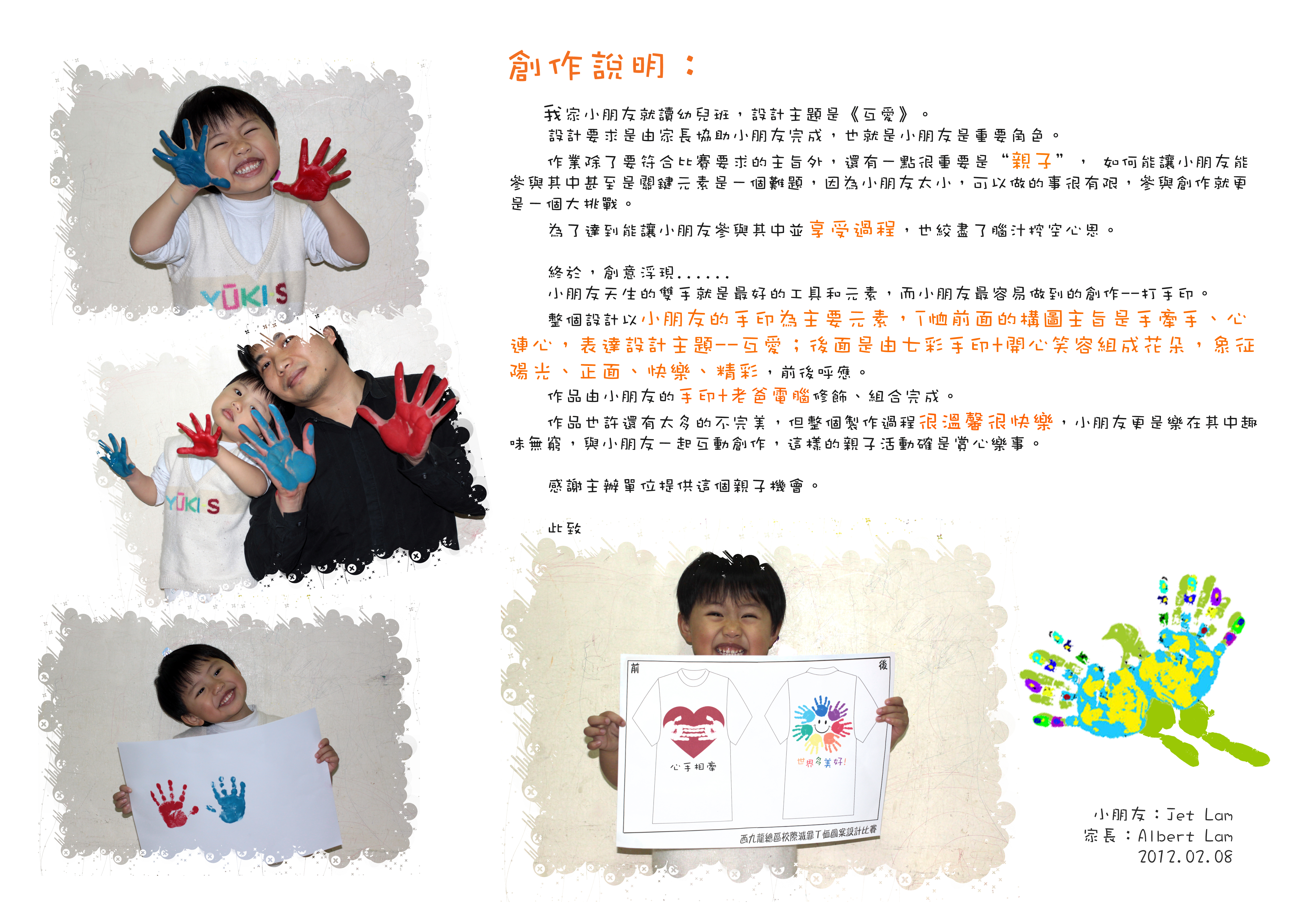 今次收到JETJET學校一個由西九龍總區防止罪案辦公室和西九龍護青委員會主辦的名為《西九龍總區校際滅罪T恤圖案設計比賽》作業,適逢我較為事忙,沒法專注構思完成作業,怕完成不了更怕完成不好,更不想敷衍隨便交個作業了事,因個人是嚴重的完美主義者,做事要麼不做,要做就做到自己認為最好才罷休。而在個人理解是,今次的作業除了要符合征稿要求的主旨外,還有一點很重要是“親子”,所以如何能讓小朋友能參與其中甚至是關鍵元素是一個難題,因為小朋友太小,可以做的事很有限,參與創作就更是一個大挑戰。為了達到能讓小朋友參與其中並享受過程,一有閑時就挖空心思構想用什麼元素表現才能完成任務。終於想出小朋友天生的雙手就是最好的工具和元素,就用小朋友最容易做到的創作–打手印來作基本元素,加以合適的構圖組合相信可以創作出能表達主題的作品。