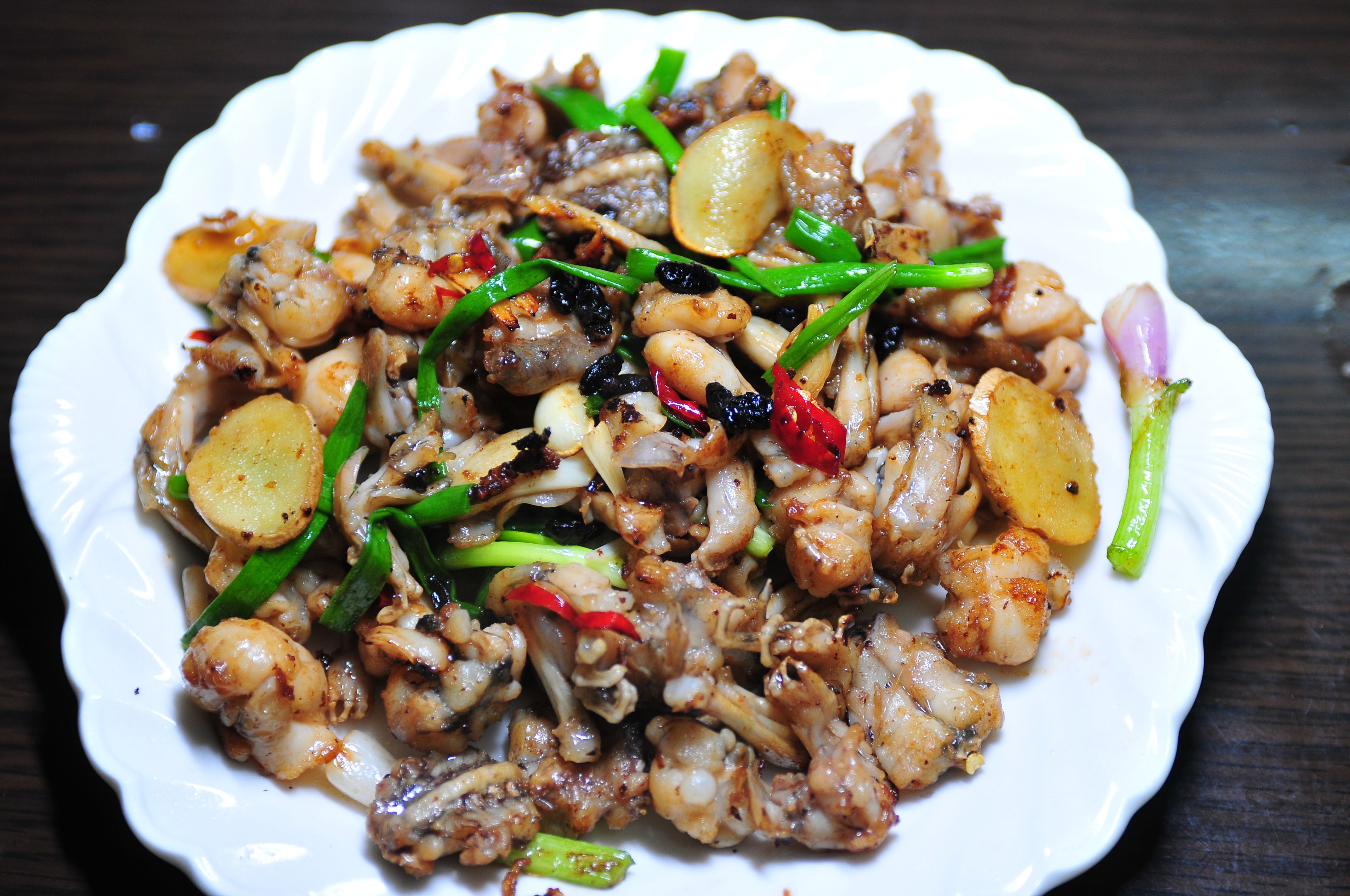 1、燒紅鍋落少許生油(或直接用剛才倒掉油的鍋不用洗),加入姜、蒜片及葱頭(喜歡食辣的可加入辣椒,也可以上碟前後加)爆香,加入豆鼓翻炒一下,倒入炸過的田雞