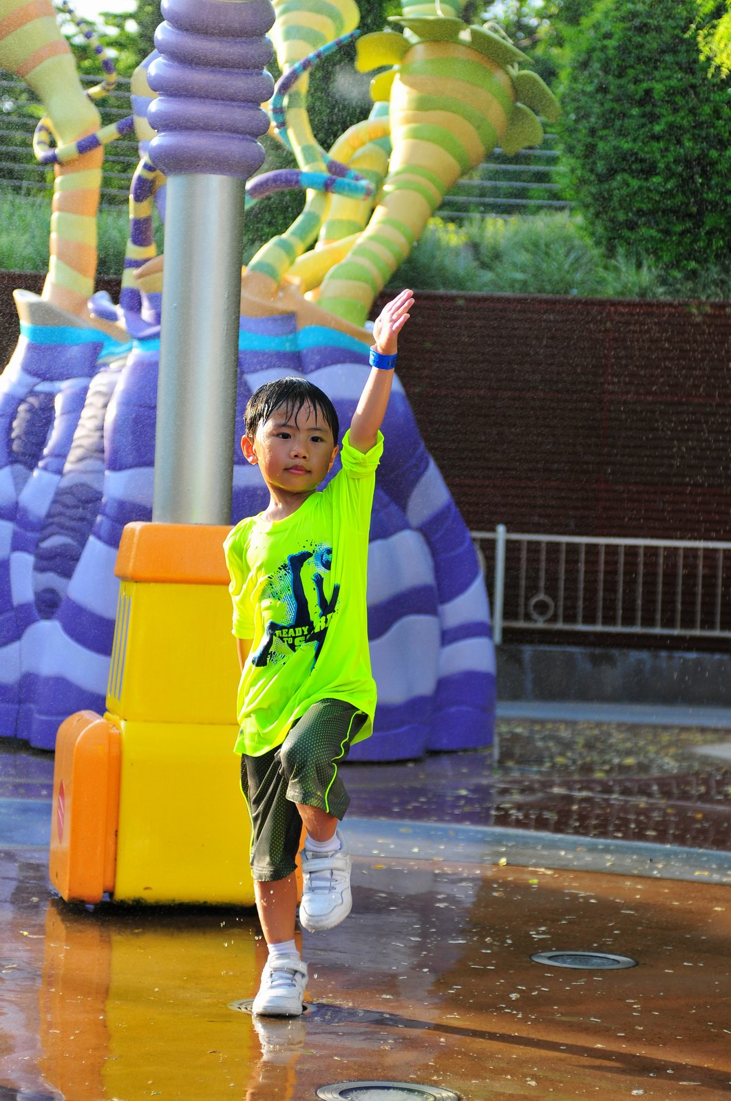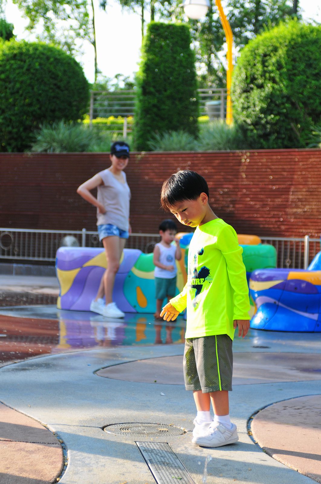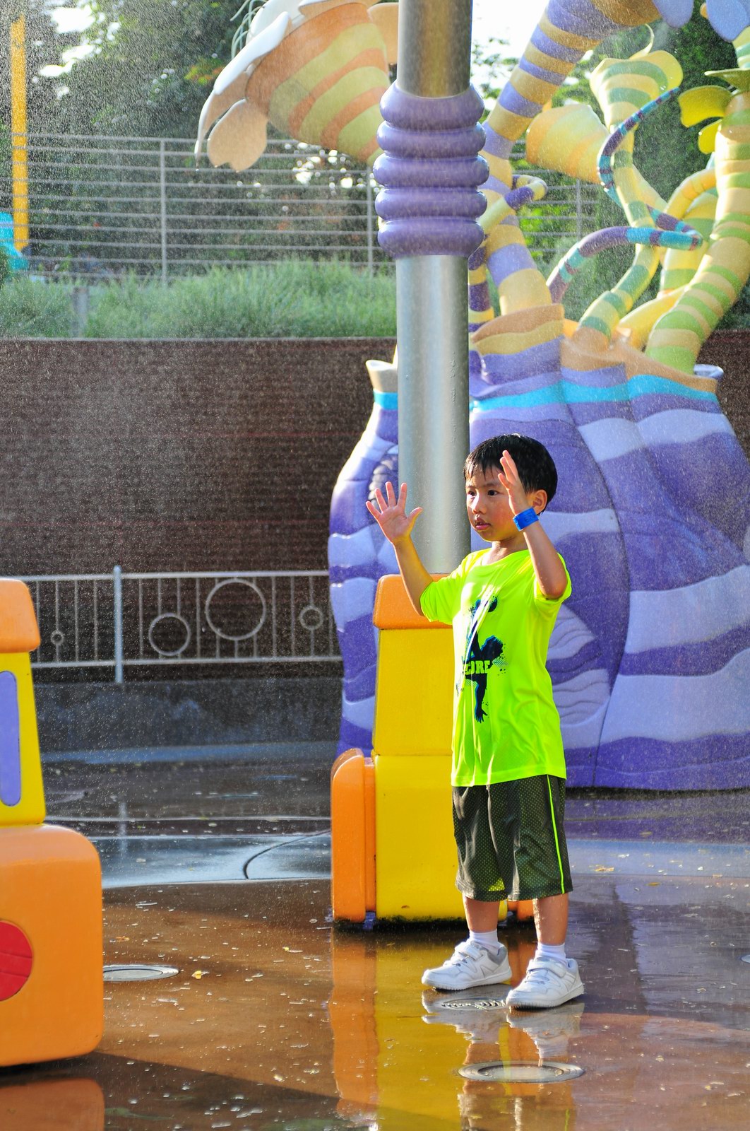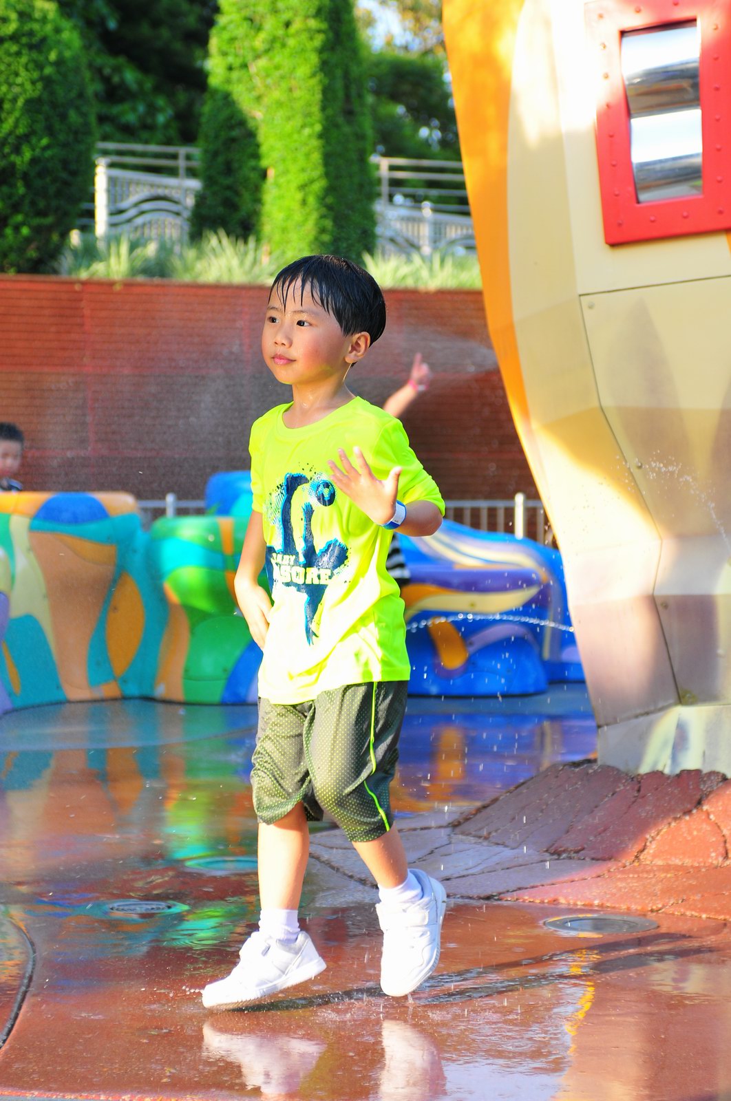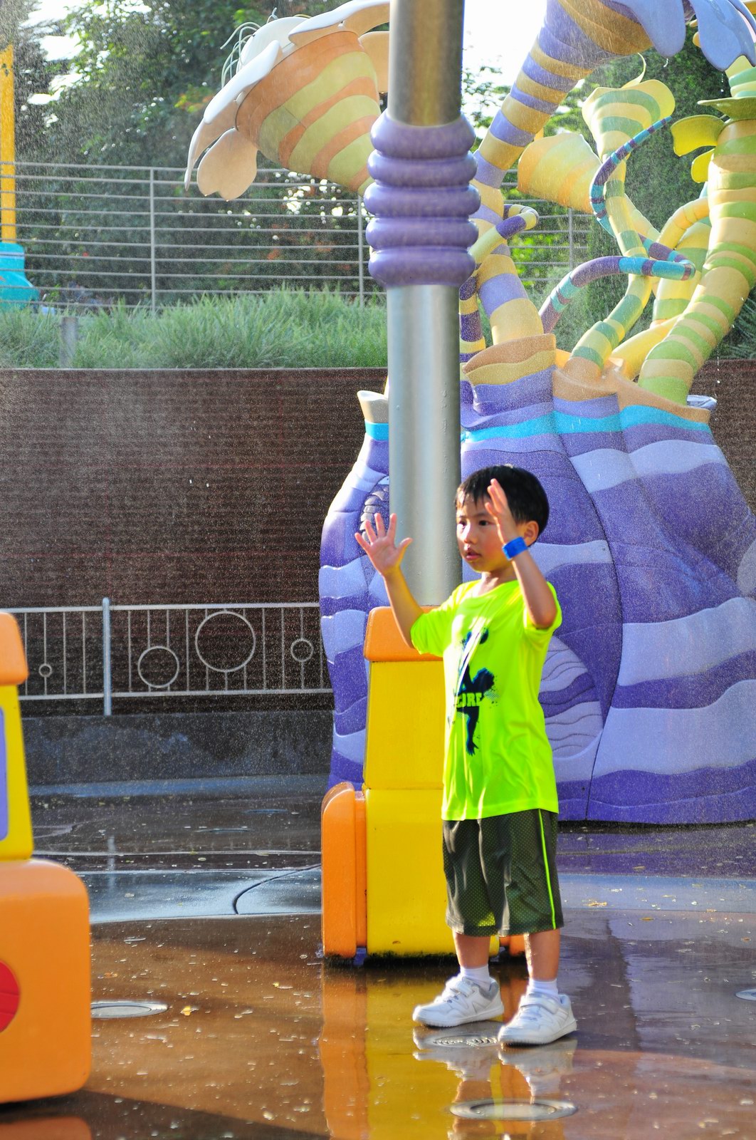 影完相,開始自遊活動時間,由於是星期三,並非樂園假日高峰期,遊園人數不算多,設施輪侯時間並不長,所以JETJET可以很暢順地一口氣玩完多個他喜歡的遊戲,有些特喜歡的還可以連玩多次,很是盡興,這種好處是平時節假日無法享受的。開心時間過得快,黃昏將至,我們去到JETJET的另一個至愛樂園,一個給小朋友消暑玩耍的噴水戲樂區。你會發現,自由自在、無拘放縱的戲樂對於小朋友是多麼的渴望與享受,Jet在水樂園盡情奔跑、跳躍,任由水花氣霧霖沐,無懼衣服鞋襪濕透。從他的歡樂、雀躍程度,樂園其他機動設施及節目已相比失色多了。JET在嬉水區玩了整一小時,直至天色已暗,才依依不舍踏入歸程。