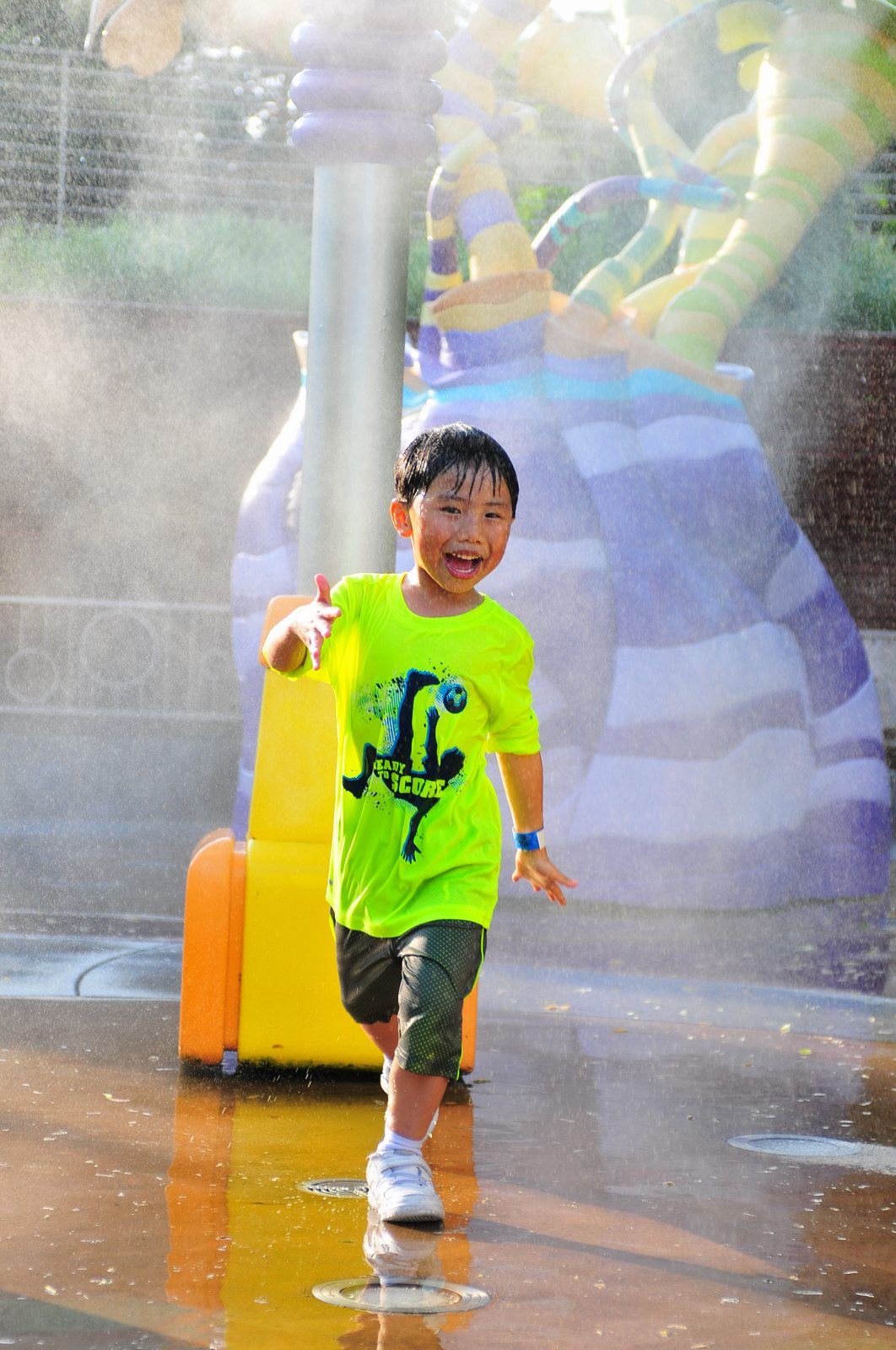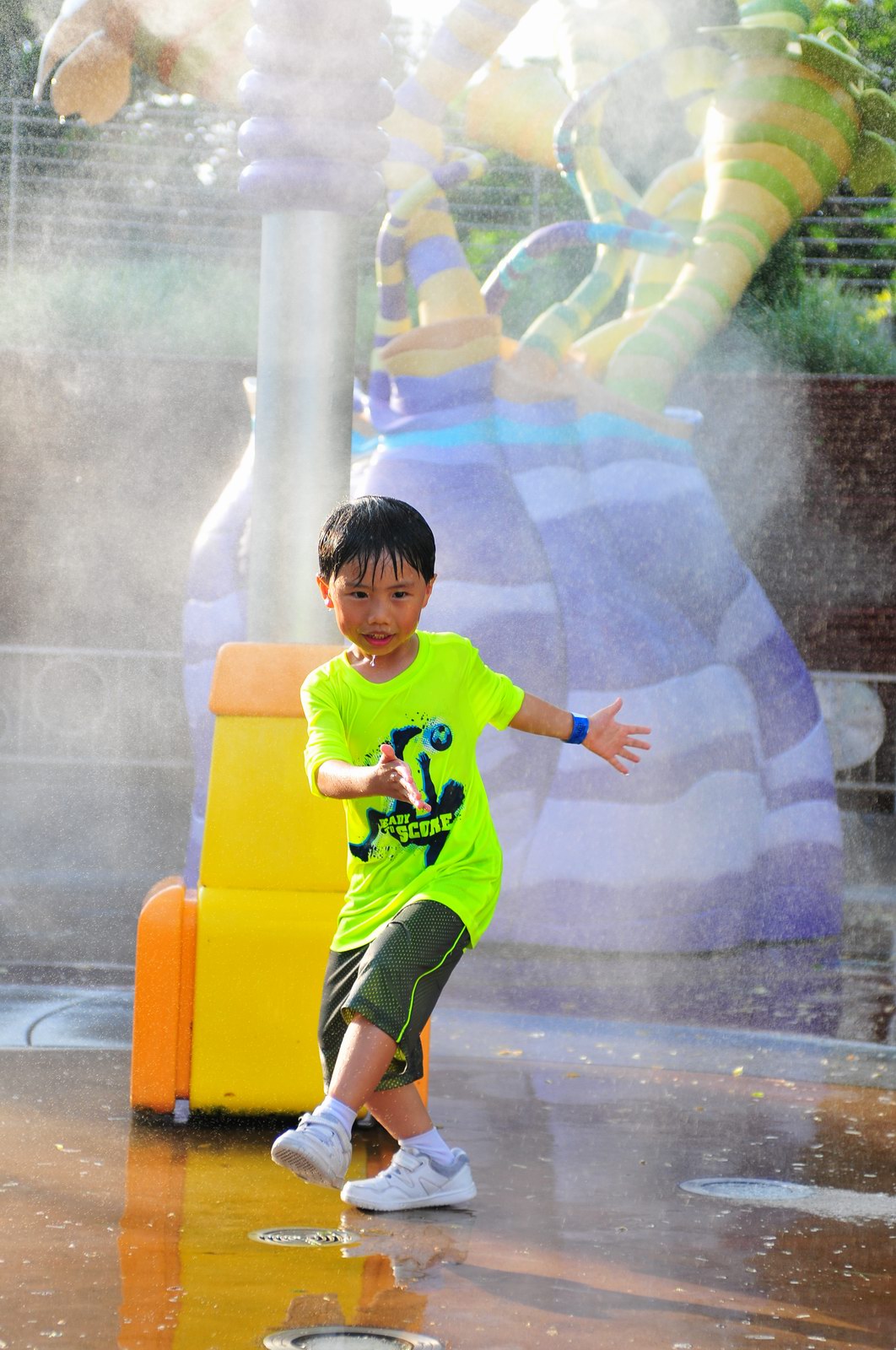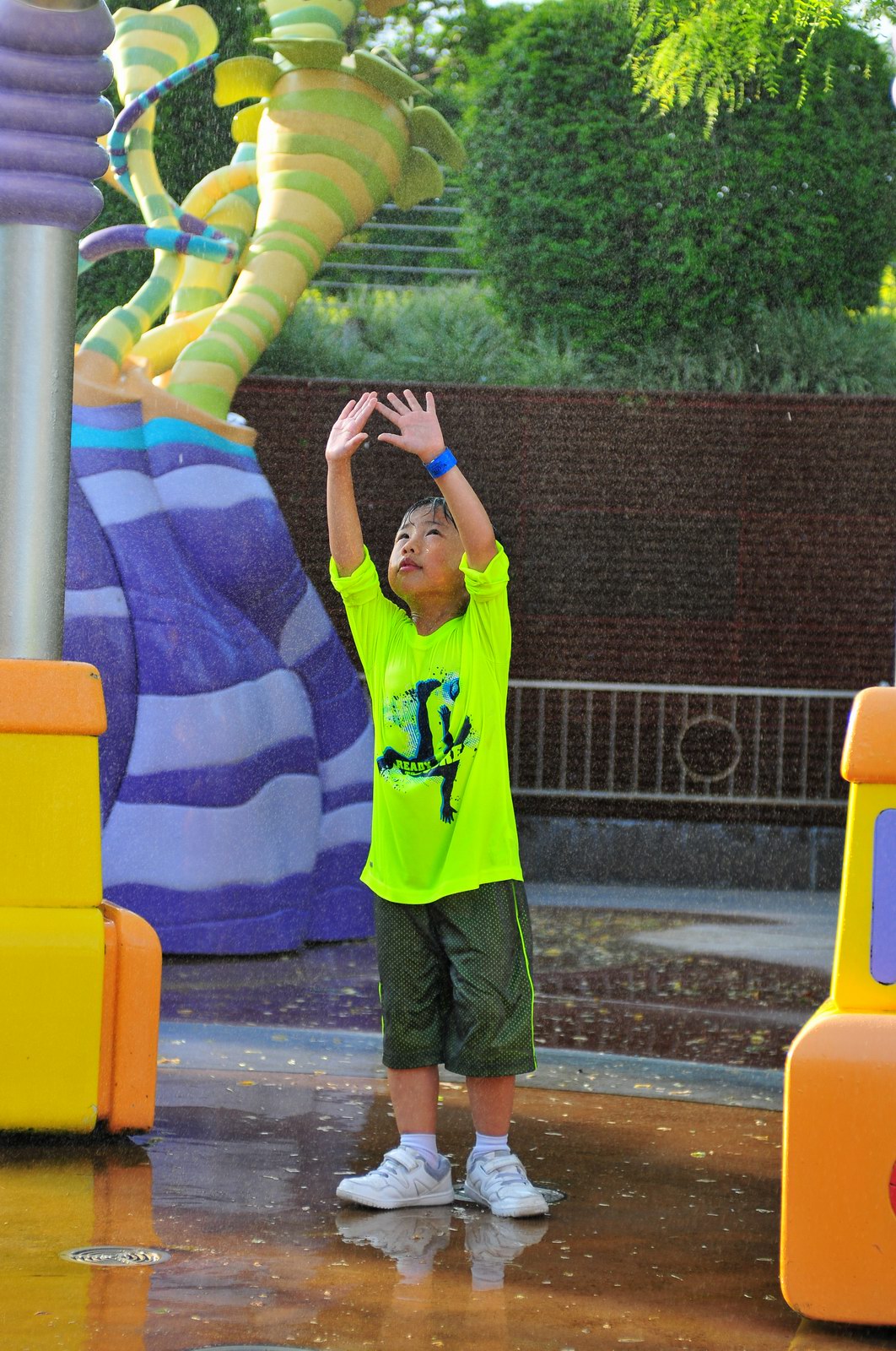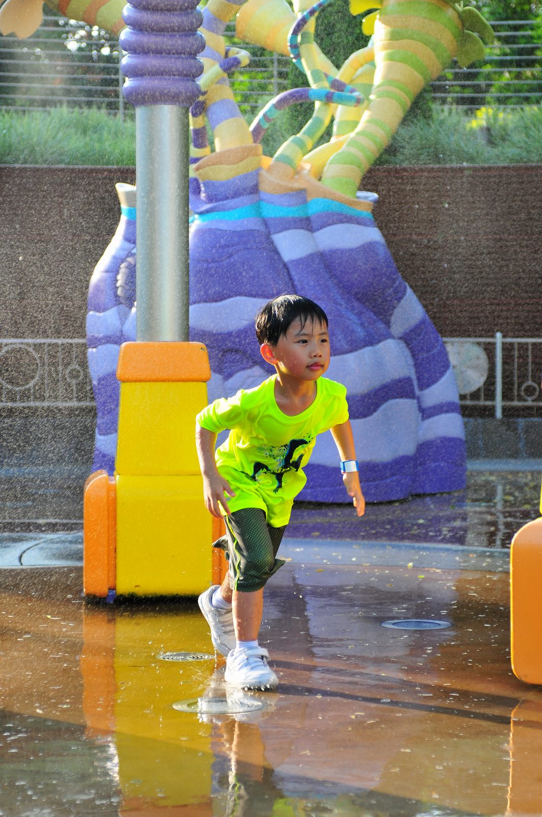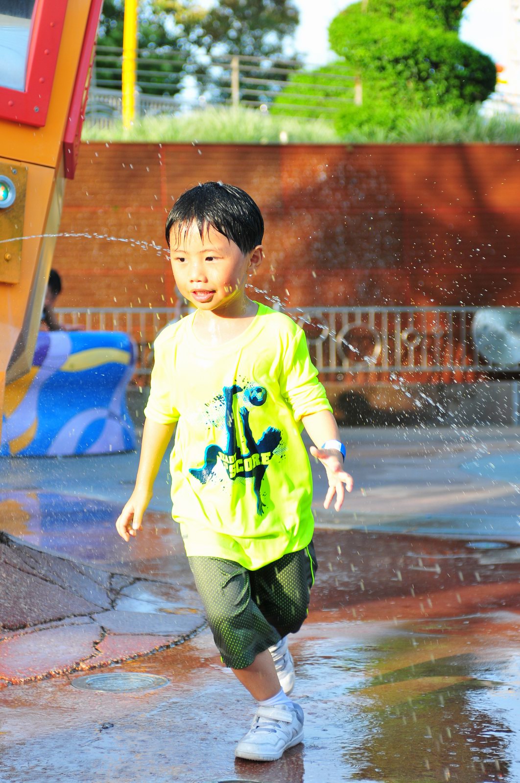 影完相,開始自遊活動時間,由於是星期三,並非樂園假日高峰期,遊園人數不算多,設施輪侯時間並不長,所以JETJET可以很暢順地一口氣玩完多個他喜歡的遊戲,有些特喜歡的還可以連玩多次,很是盡興,這種好處是平時節假日無法享受的。開心時間過得快,黃昏將至,我們去到JETJET的另一個至愛樂園,一個給小朋友消暑玩耍的噴水戲樂區。你會發現,自由自在、無拘放縱的戲樂對於小朋友是多麼的渴望與享受,Jet在水樂園盡情奔跑、跳躍,任由水花氣霧霖沐,無懼衣服鞋襪濕透。從他的歡樂、雀躍程度,樂園其他機動設施及節目已相比失色多了。JET在嬉水區玩了整一小時,直至天色已暗,才依依不舍踏入歸程。