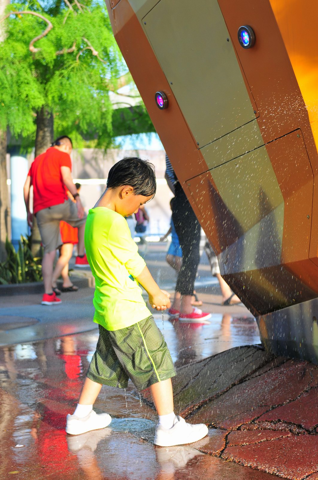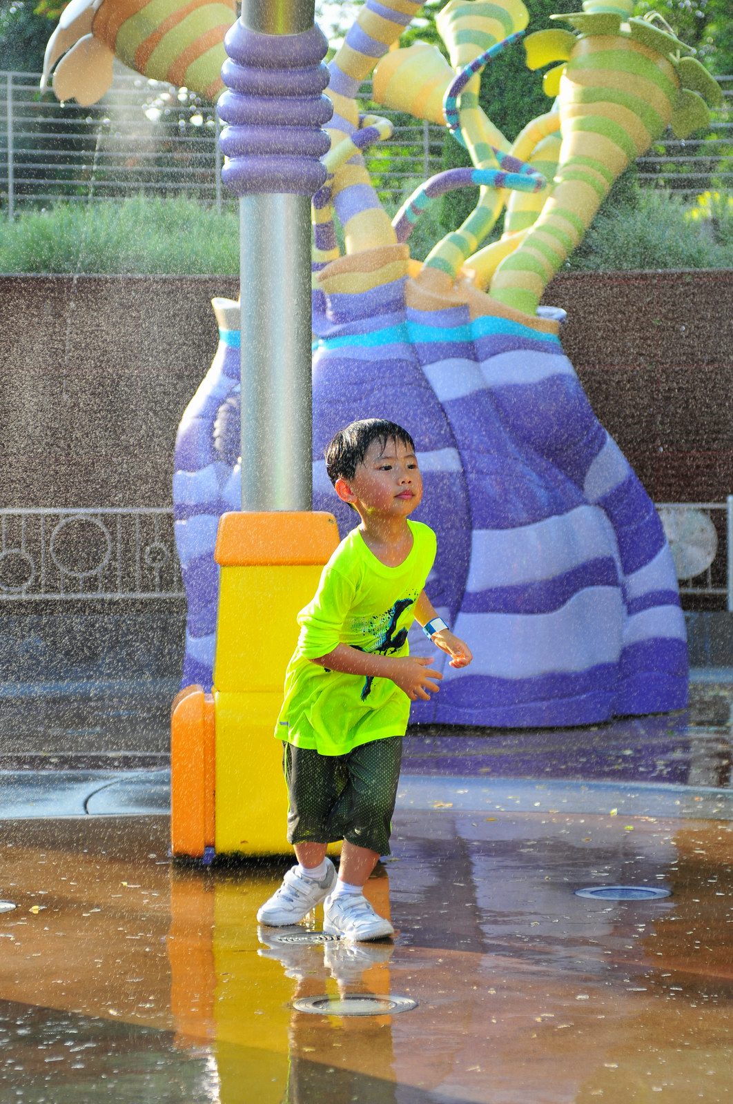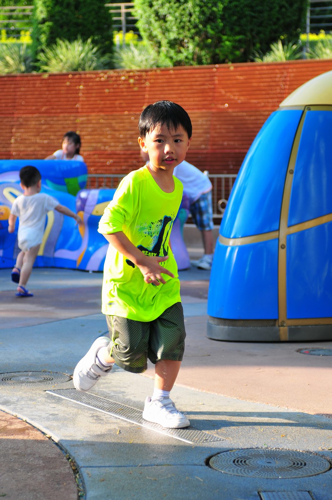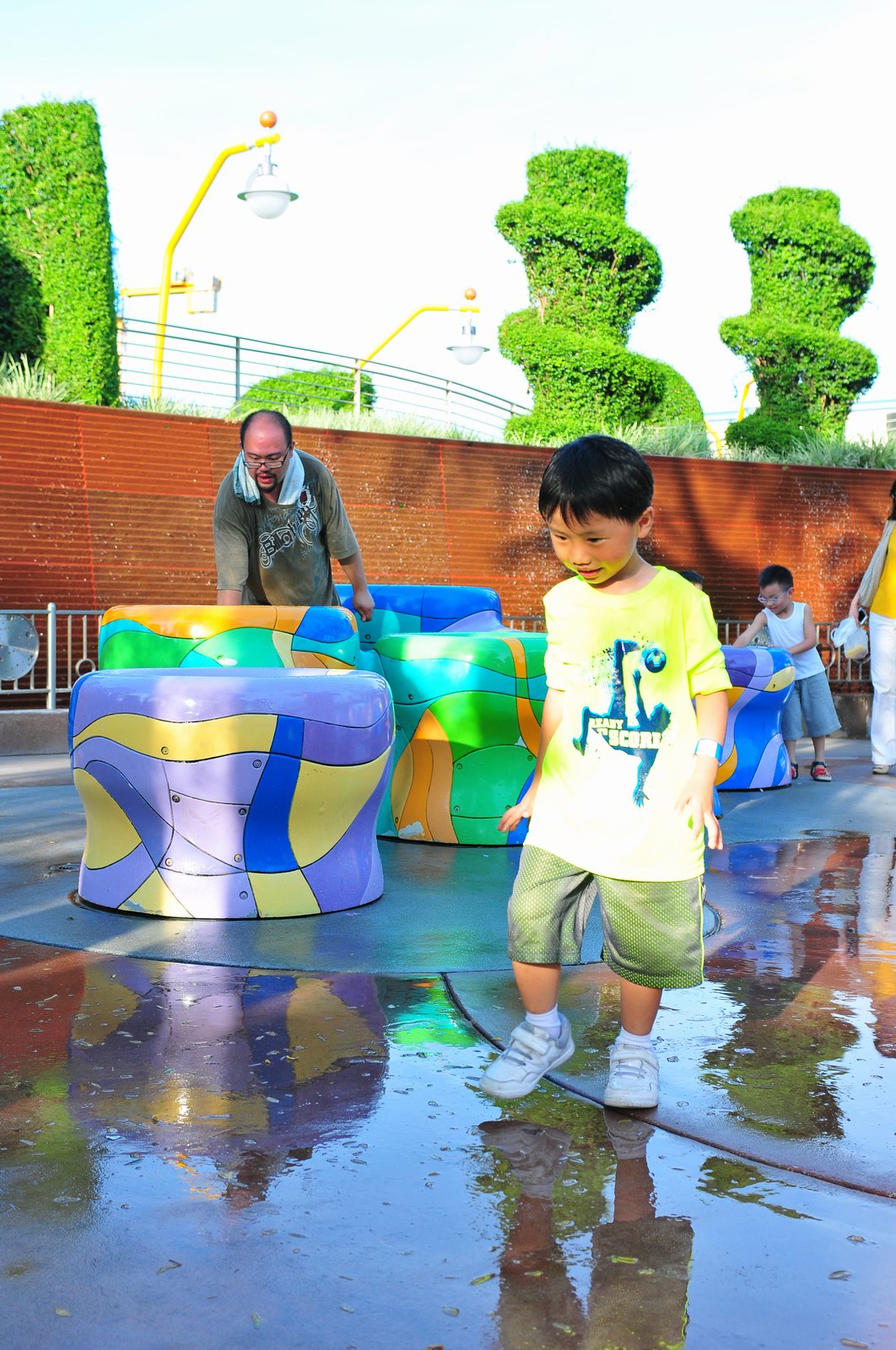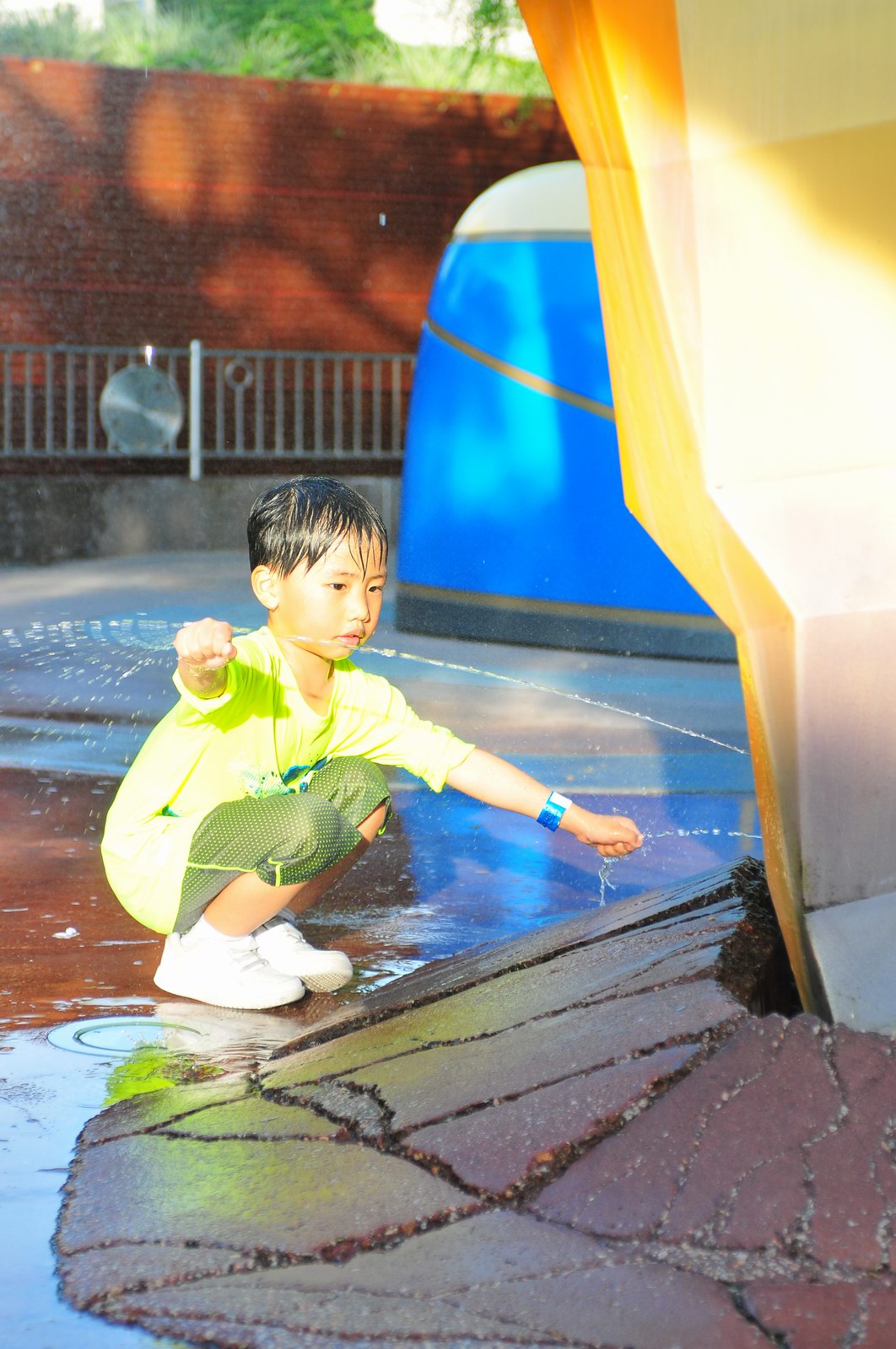 影完相,開始自遊活動時間,由於是星期三,並非樂園假日高峰期,遊園人數不算多,設施輪侯時間並不長,所以JETJET可以很暢順地一口氣玩完多個他喜歡的遊戲,有些特喜歡的還可以連玩多次,很是盡興,這種好處是平時節假日無法享受的。開心時間過得快,黃昏將至,我們去到JETJET的另一個至愛樂園,一個給小朋友消暑玩耍的噴水戲樂區。你會發現,自由自在、無拘放縱的戲樂對於小朋友是多麼的渴望與享受,Jet在水樂園盡情奔跑、跳躍,任由水花氣霧霖沐,無懼衣服鞋襪濕透。從他的歡樂、雀躍程度,樂園其他機動設施及節目已相比失色多了。JET在嬉水區玩了整一小時,直至天色已暗,才依依不舍踏入歸程。