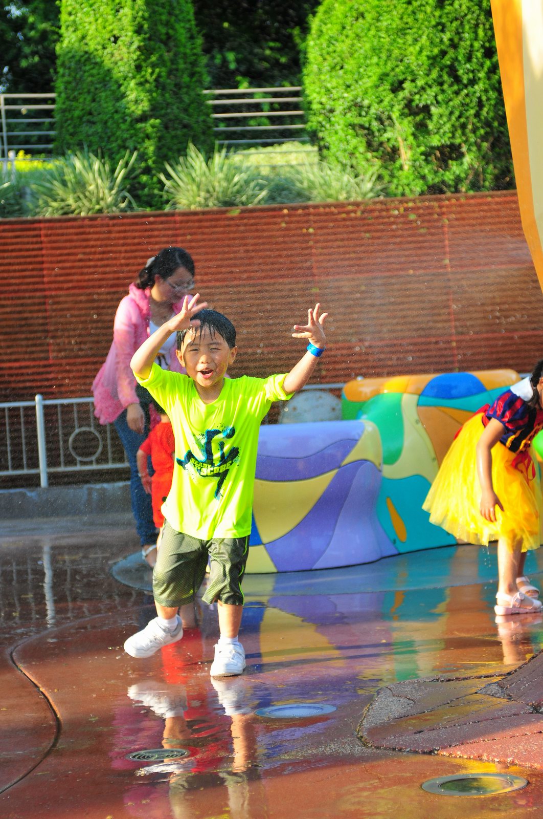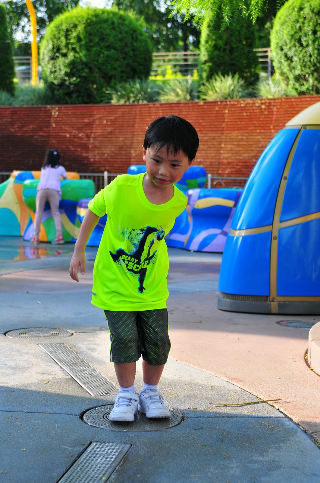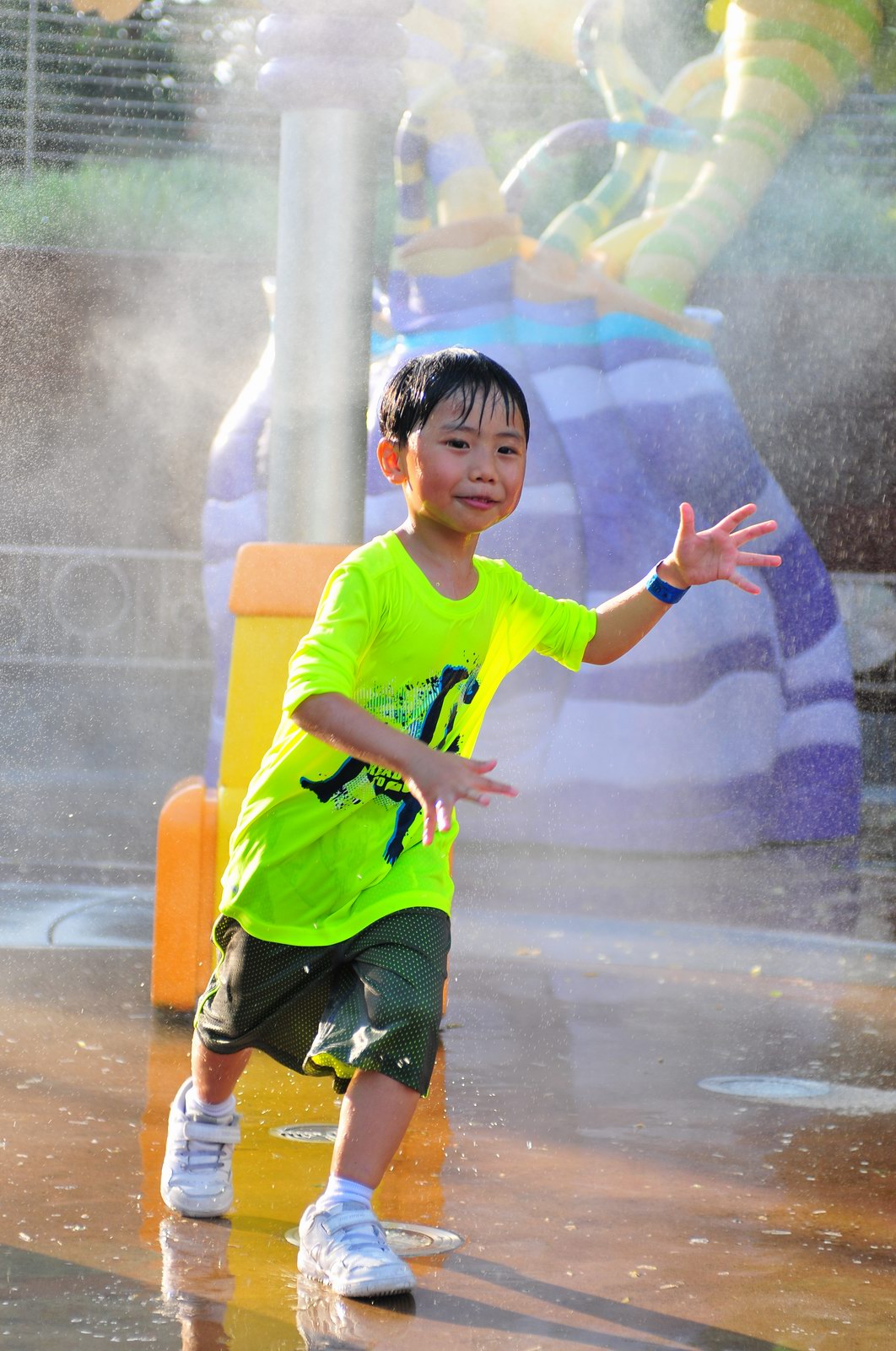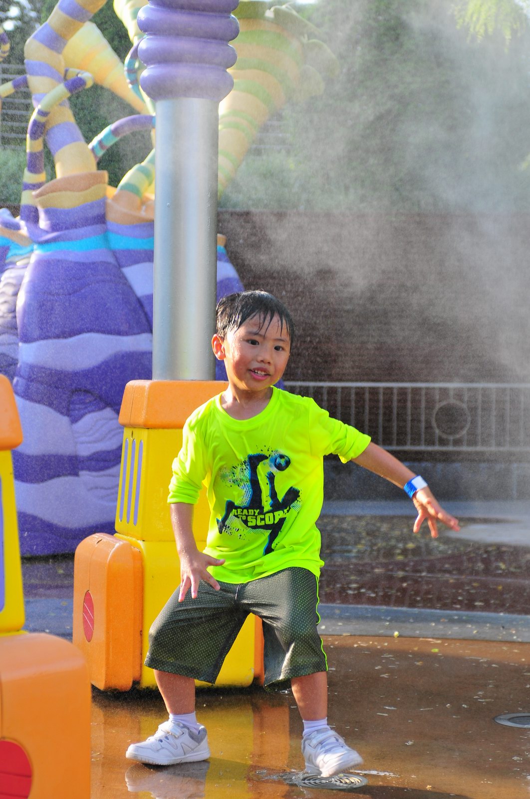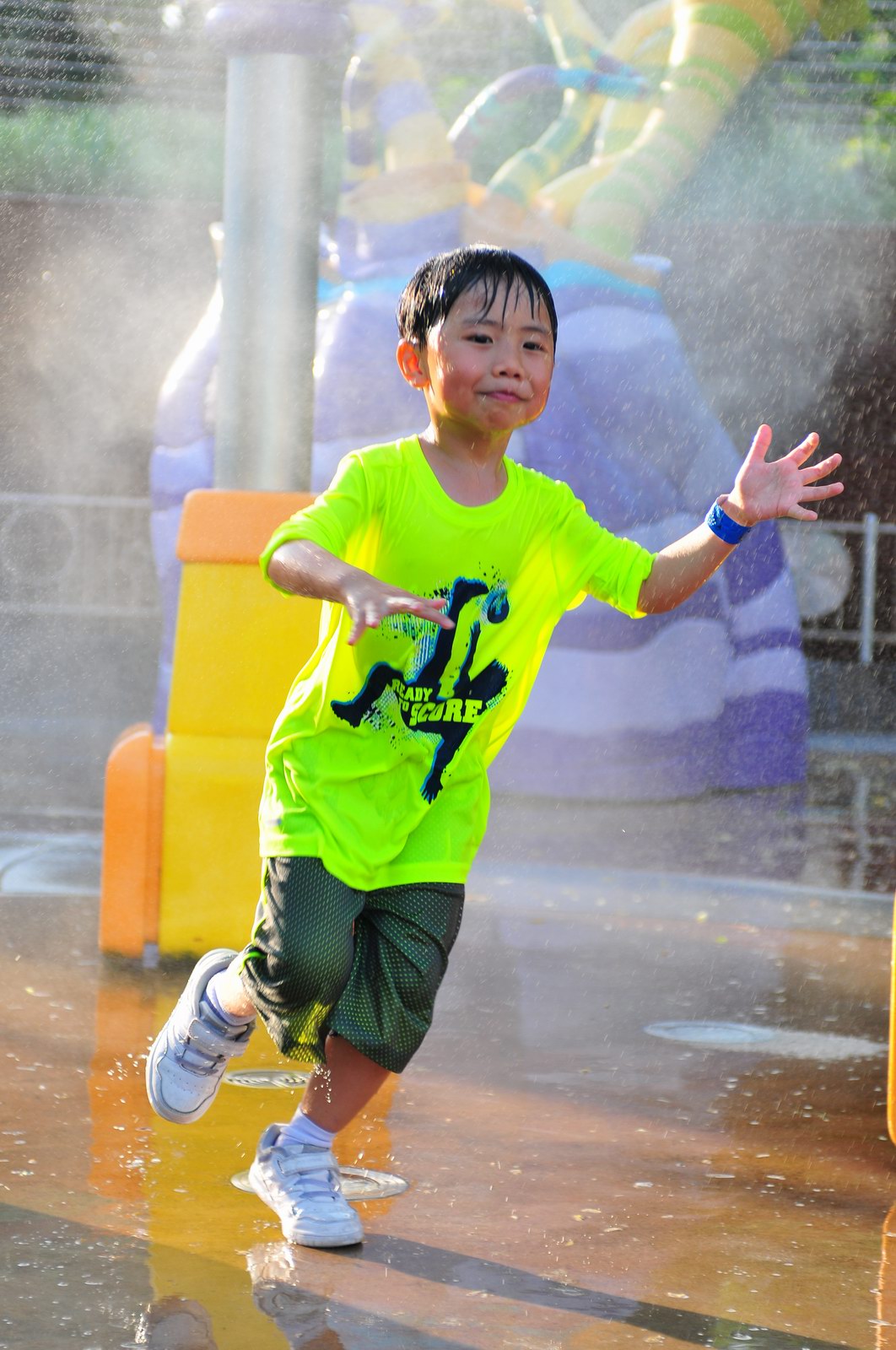影完相,開始自遊活動時間,由於是星期三,並非樂園假日高峰期,遊園人數不算多,設施輪侯時間並不長,所以JETJET可以很暢順地一口氣玩完多個他喜歡的遊戲,有些特喜歡的還可以連玩多次,很是盡興,這種好處是平時節假日無法享受的。開心時間過得快,黃昏將至,我們去到JETJET的另一個至愛樂園,一個給小朋友消暑玩耍的噴水戲樂區。你會發現,自由自在、無拘放縱的戲樂對於小朋友是多麼的渴望與享受,Jet在水樂園盡情奔跑、跳躍,任由水花氣霧霖沐,無懼衣服鞋襪濕透。從他的歡樂、雀躍程度,樂園其他機動設施及節目已相比失色多了。JET在嬉水區玩了整一小時,直至天色已暗,才依依不舍踏入歸程。