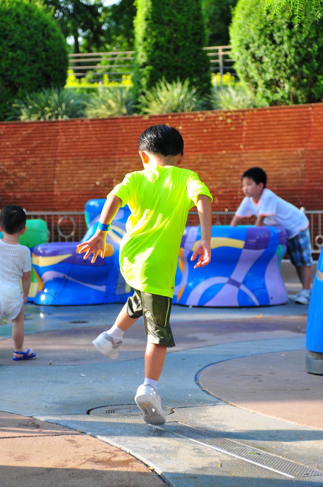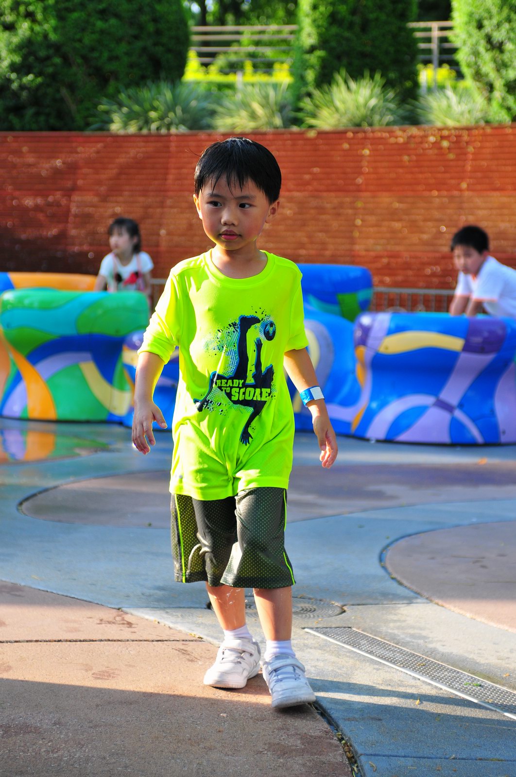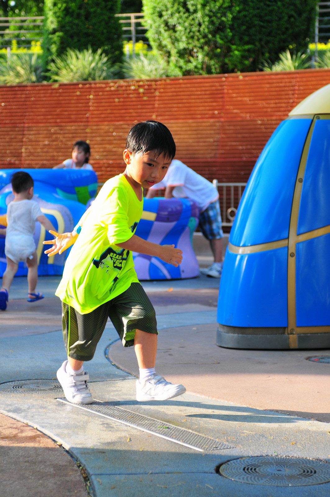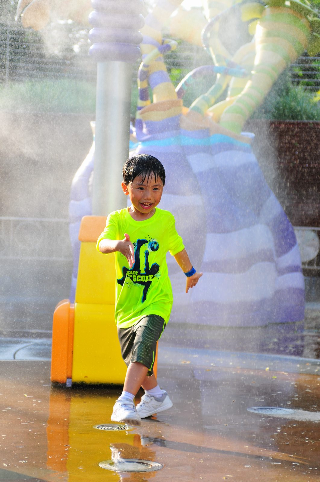 影完相,開始自遊活動時間,由於是星期三,並非樂園假日高峰期,遊園人數不算多,設施輪侯時間並不長,所以JETJET可以很暢順地一口氣玩完多個他喜歡的遊戲,有些特喜歡的還可以連玩多次,很是盡興,這種好處是平時節假日無法享受的。開心時間過得快,黃昏將至,我們去到JETJET的另一個至愛樂園,一個給小朋友消暑玩耍的噴水戲樂區。你會發現,自由自在、無拘放縱的戲樂對於小朋友是多麼的渴望與享受,Jet在水樂園盡情奔跑、跳躍,任由水花氣霧霖沐,無懼衣服鞋襪濕透。從他的歡樂、雀躍程度,樂園其他機動設施及節目已相比失色多了。JET在嬉水區玩了整一小時,直至天色已暗,才依依不舍踏入歸程。