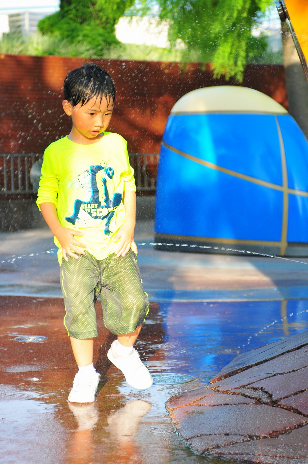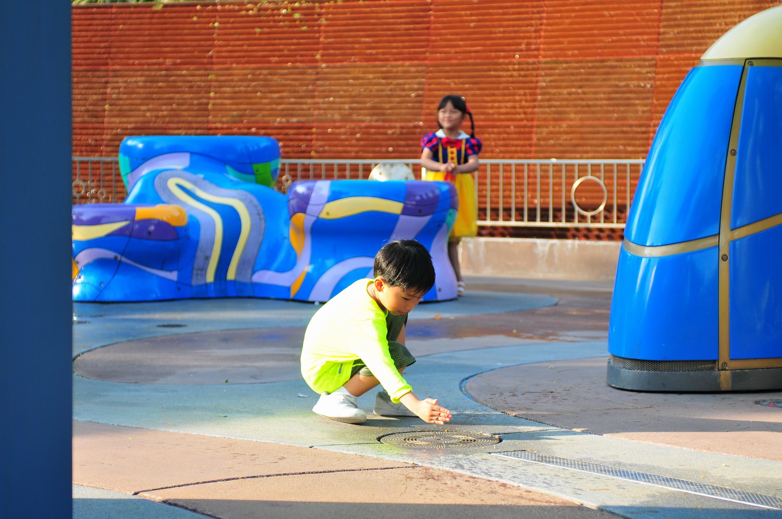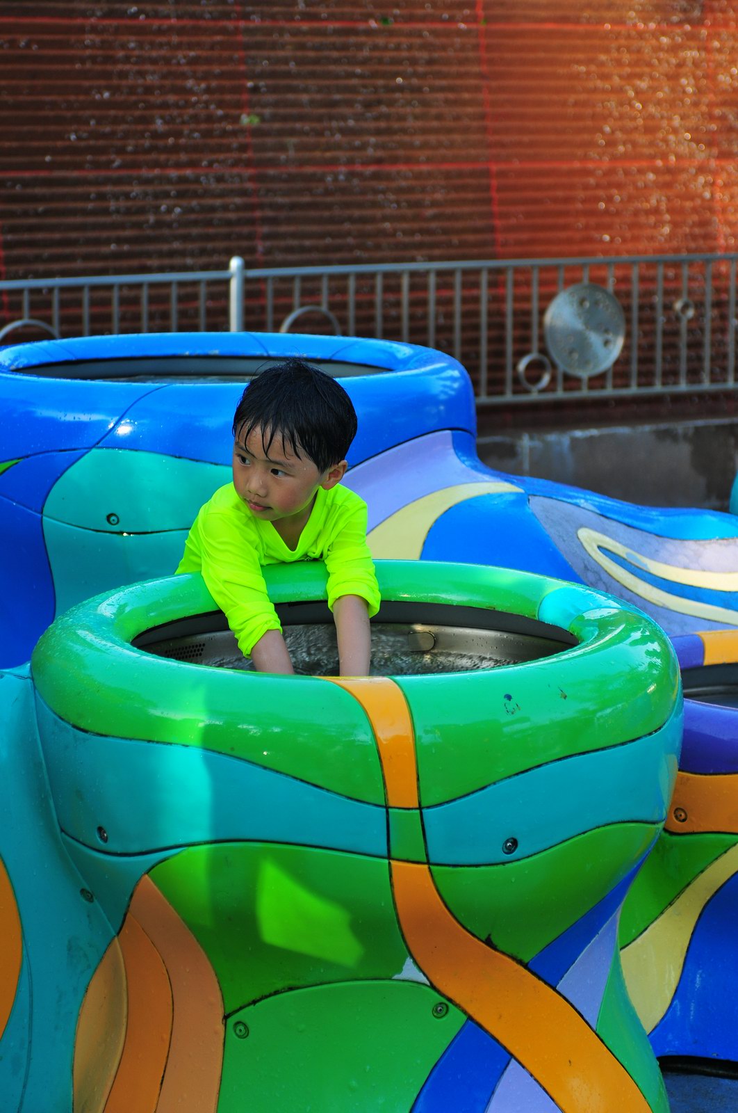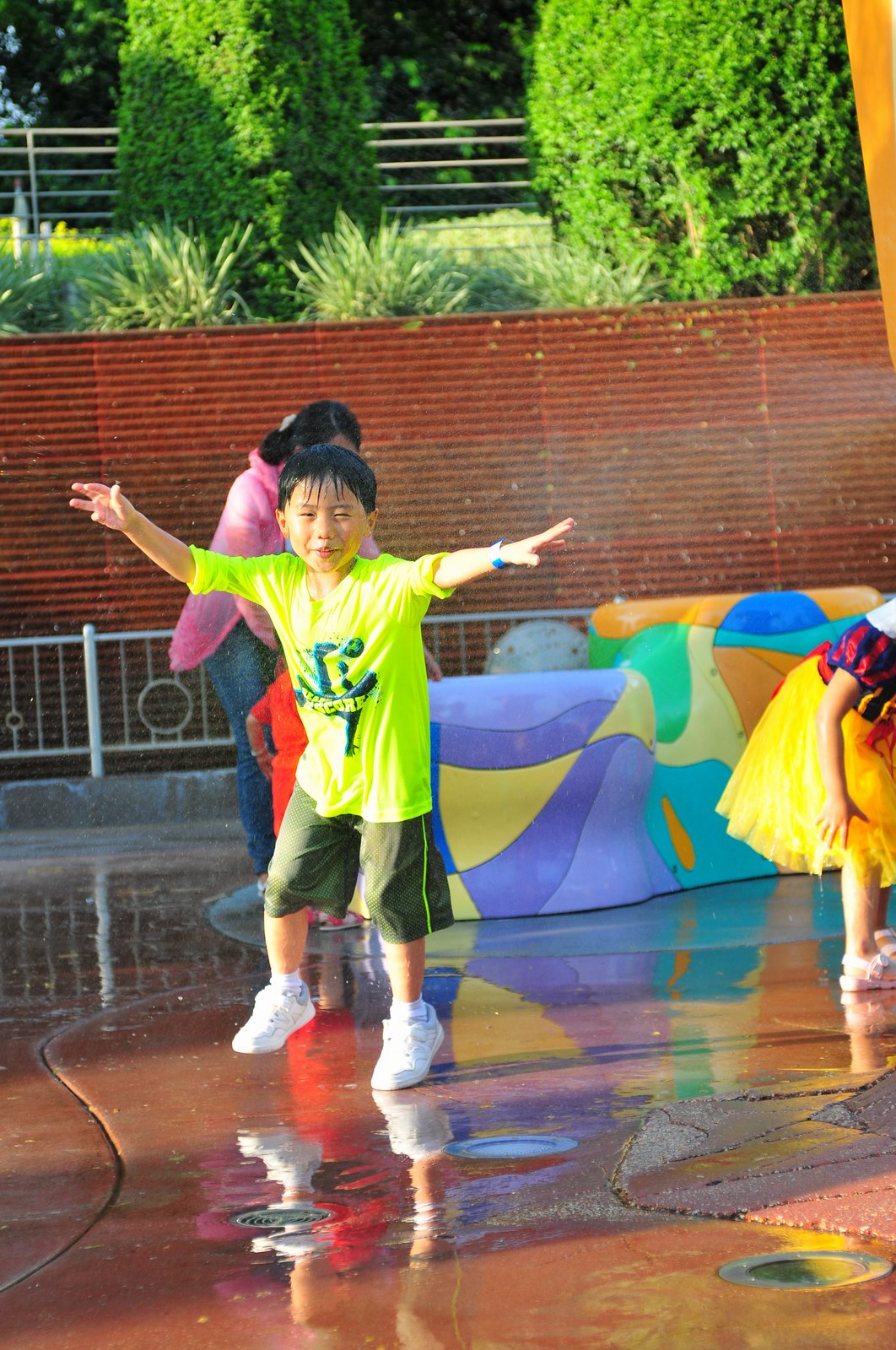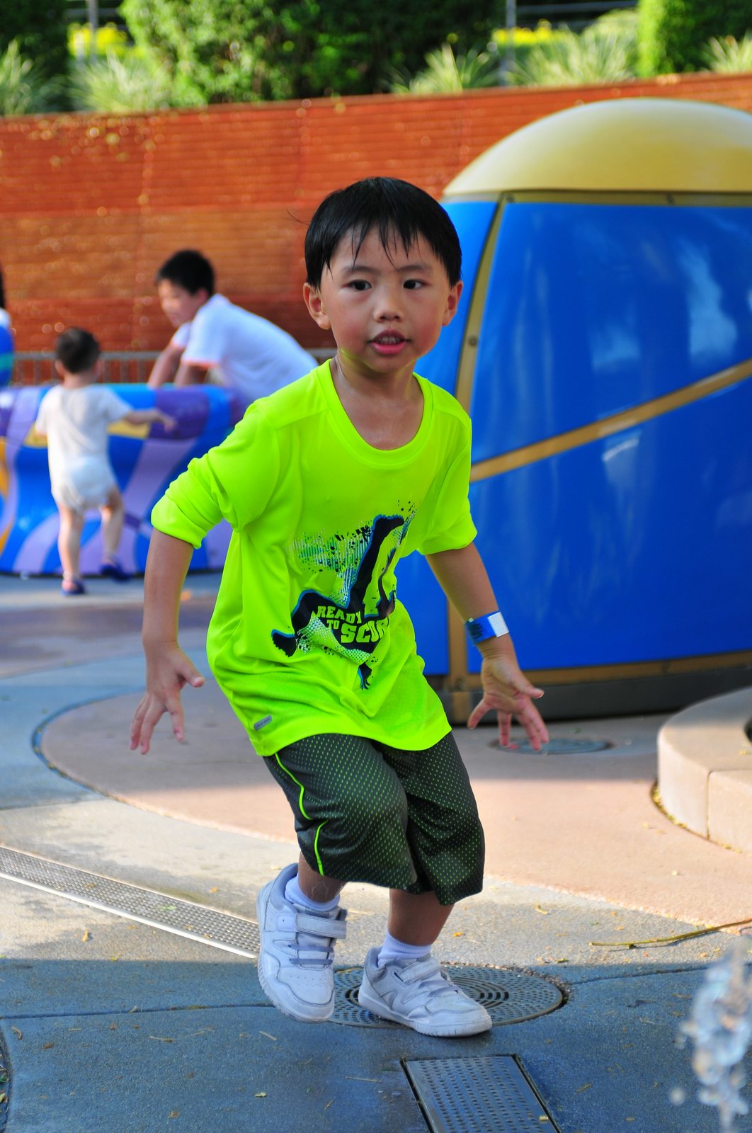 影完相,開始自遊活動時間,由於是星期三,並非樂園假日高峰期,遊園人數不算多,設施輪侯時間並不長,所以JETJET可以很暢順地一口氣玩完多個他喜歡的遊戲,有些特喜歡的還可以連玩多次,很是盡興,這種好處是平時節假日無法享受的。開心時間過得快,黃昏將至,我們去到JETJET的另一個至愛樂園,一個給小朋友消暑玩耍的噴水戲樂區。你會發現,自由自在、無拘放縱的戲樂對於小朋友是多麼的渴望與享受,Jet在水樂園盡情奔跑、跳躍,任由水花氣霧霖沐,無懼衣服鞋襪濕透。從他的歡樂、雀躍程度,樂園其他機動設施及節目已相比失色多了。JET在嬉水區玩了整一小時,直至天色已暗,才依依不舍踏入歸程。