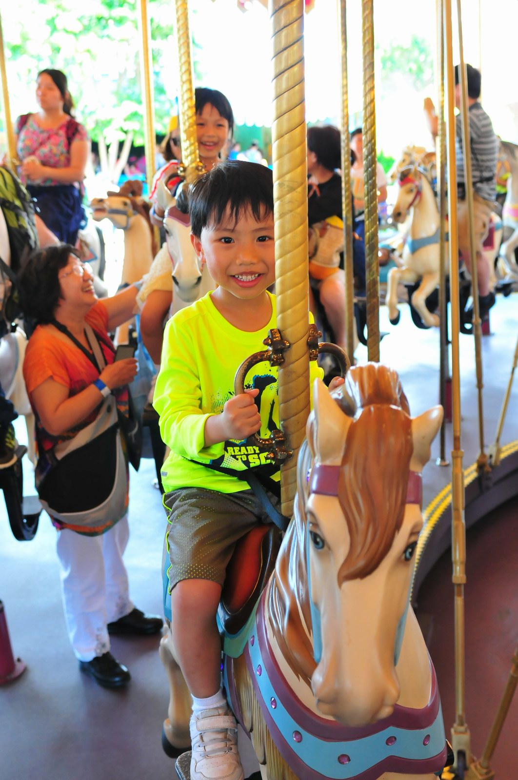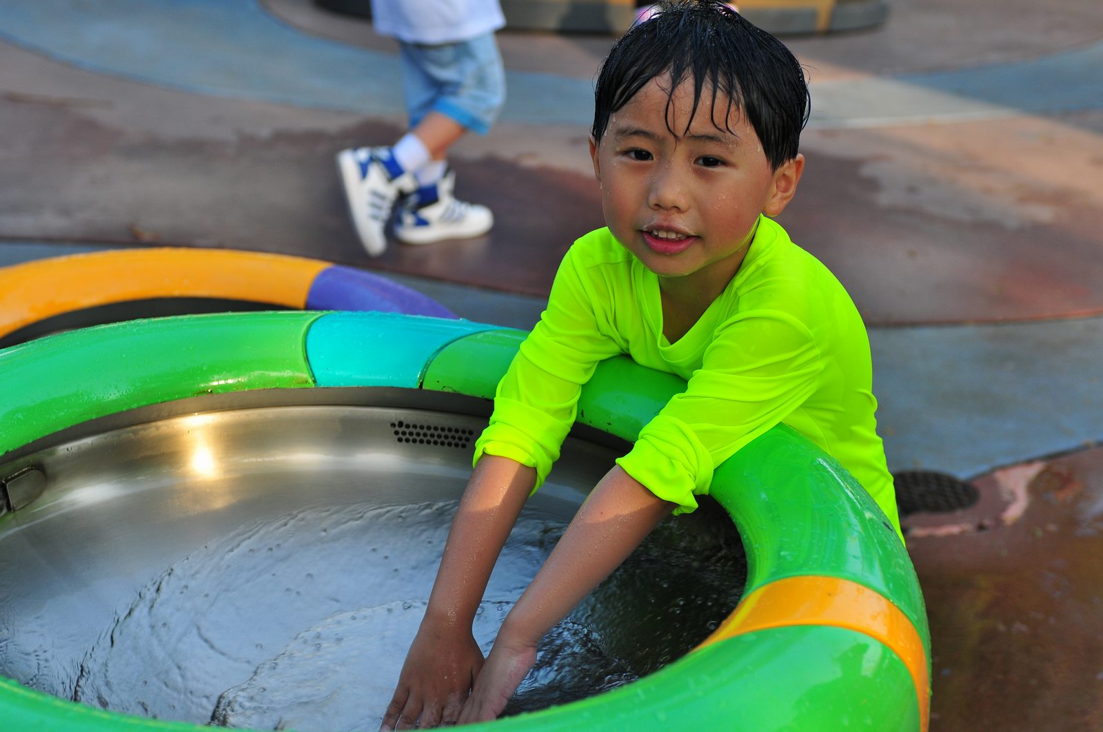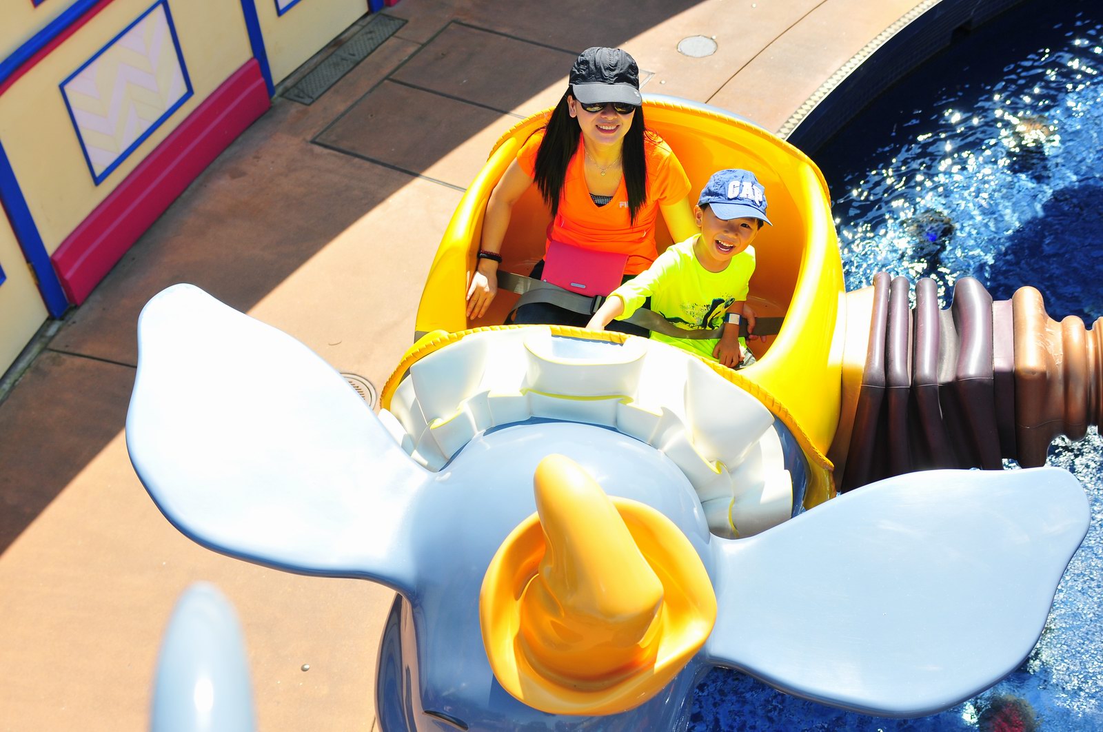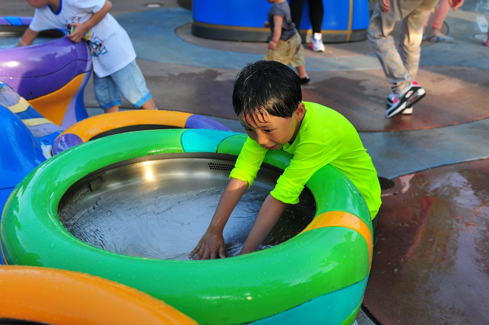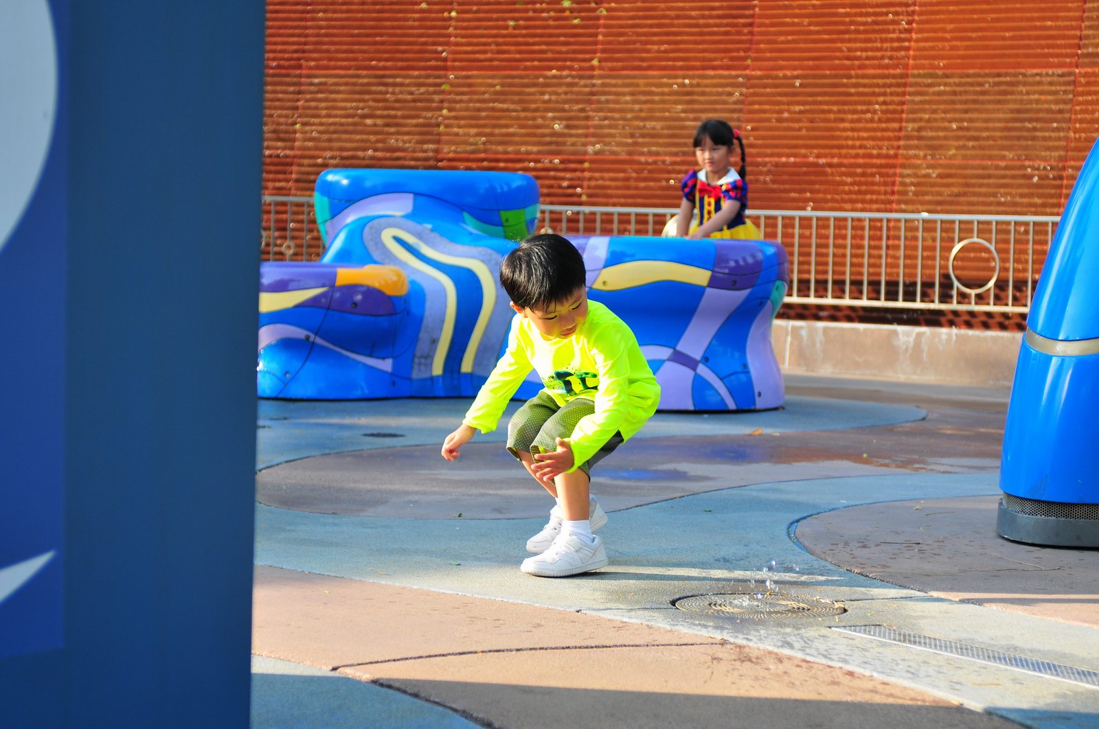 影完相,開始自遊活動時間,由於是星期三,並非樂園假日高峰期,遊園人數不算多,設施輪侯時間並不長,所以JETJET可以很暢順地一口氣玩完多個他喜歡的遊戲,有些特喜歡的還可以連玩多次,很是盡興,這種好處是平時節假日無法享受的。開心時間過得快,黃昏將至,我們去到JETJET的另一個至愛樂園,一個給小朋友消暑玩耍的噴水戲樂區。你會發現,自由自在、無拘放縱的戲樂對於小朋友是多麼的渴望與享受,Jet在水樂園盡情奔跑、跳躍,任由水花氣霧霖沐,無懼衣服鞋襪濕透。從他的歡樂、雀躍程度,樂園其他機動設施及節目已相比失色多了。JET在嬉水區玩了整一小時,直至天色已暗,才依依不舍踏入歸程。