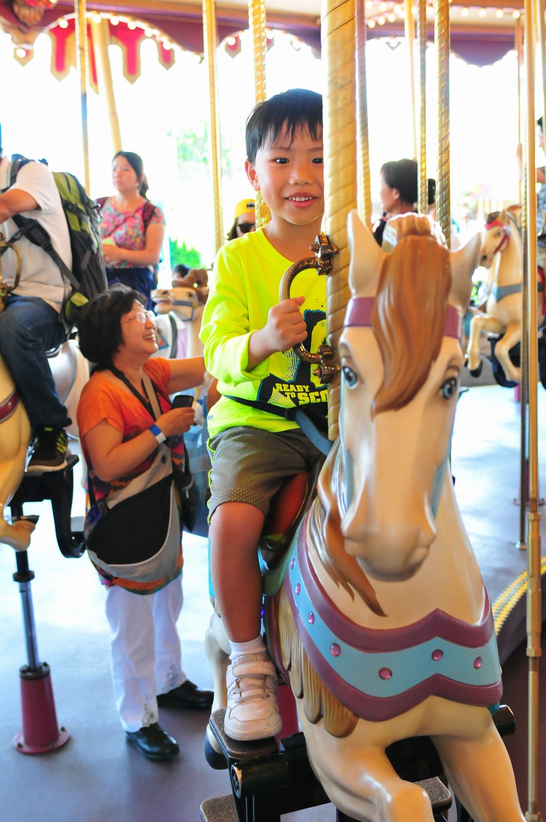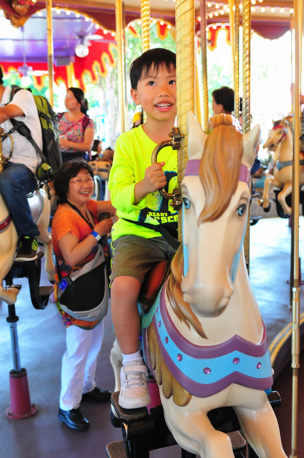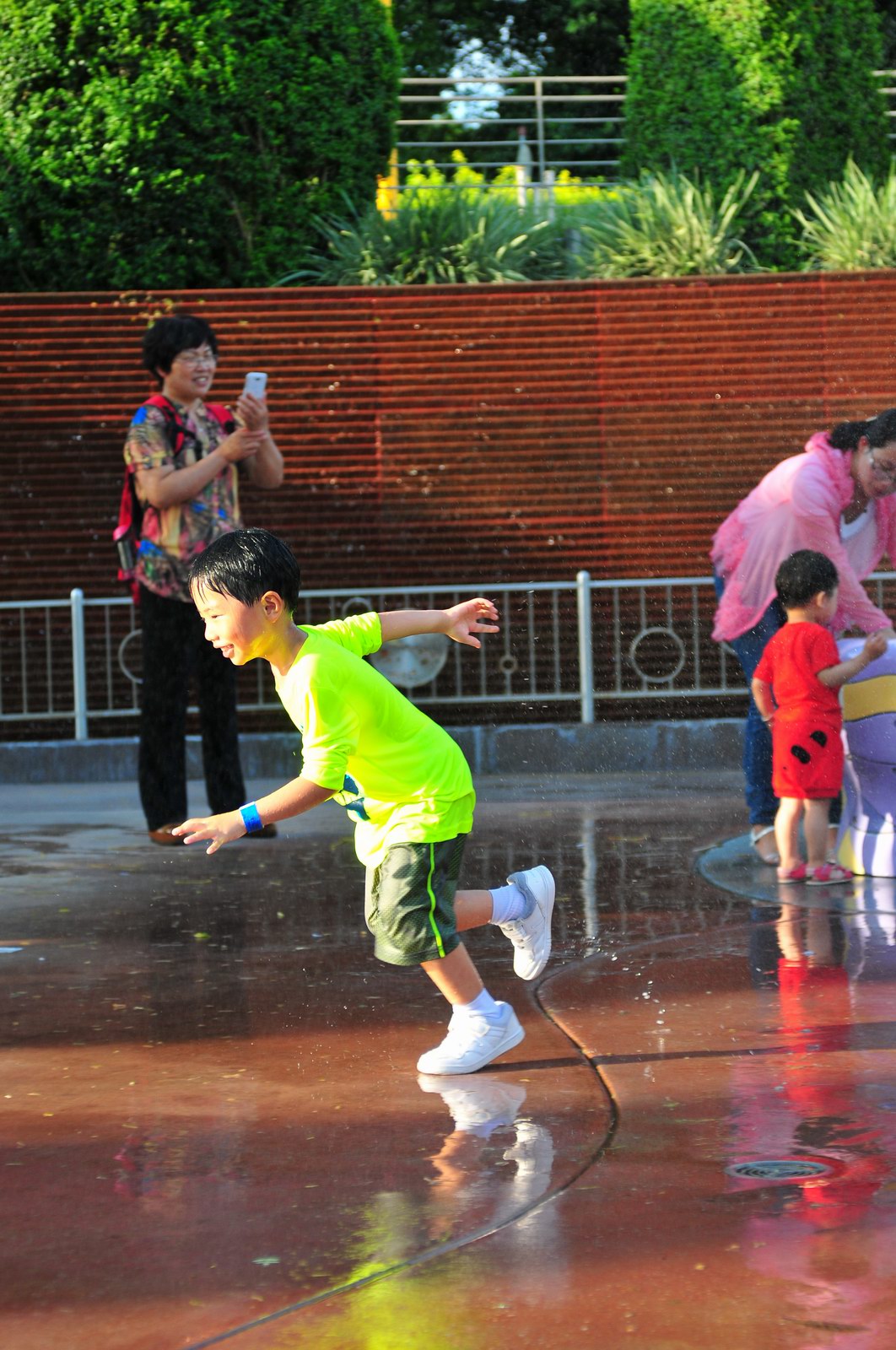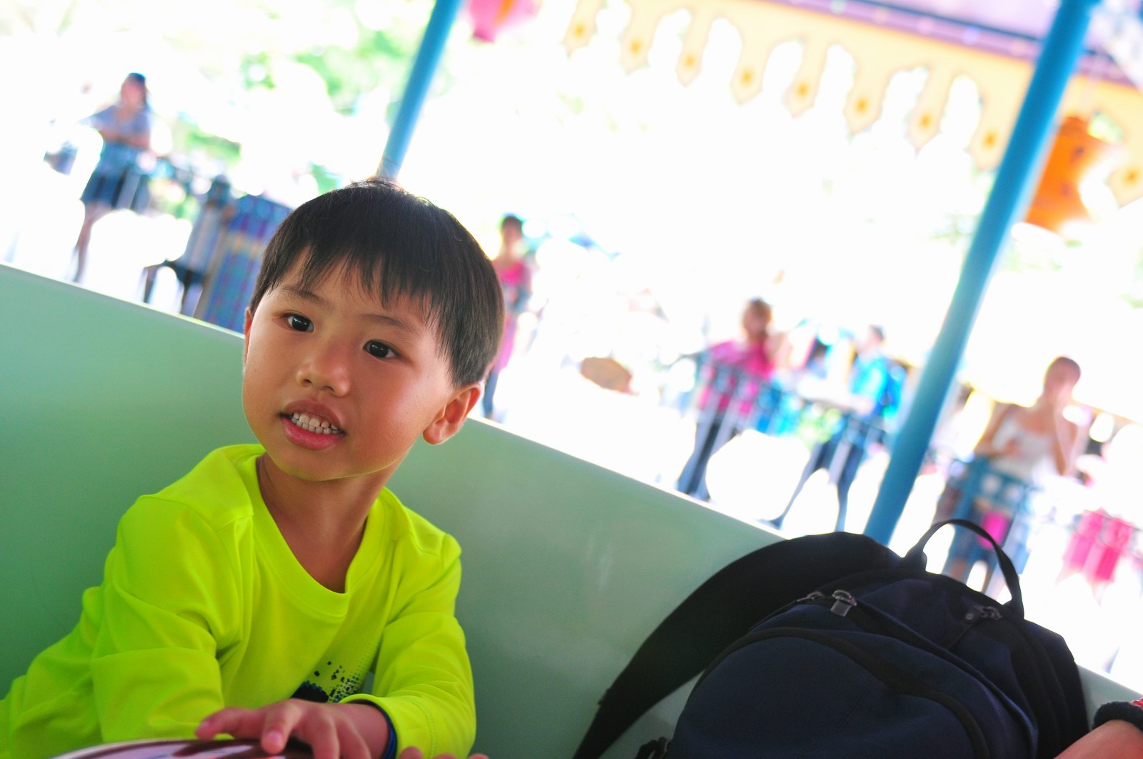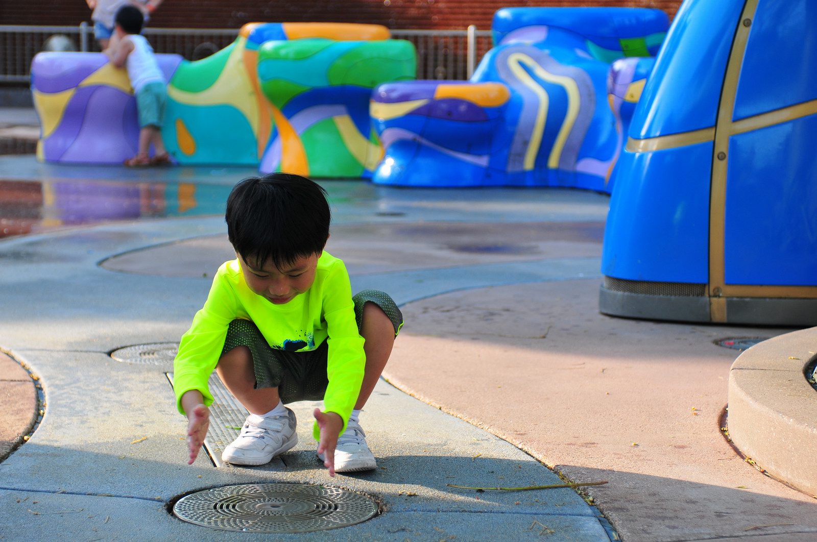影完相,開始自遊活動時間,由於是星期三,並非樂園假日高峰期,遊園人數不算多,設施輪侯時間並不長,所以JETJET可以很暢順地一口氣玩完多個他喜歡的遊戲,有些特喜歡的還可以連玩多次,很是盡興,這種好處是平時節假日無法享受的。開心時間過得快,黃昏將至,我們去到JETJET的另一個至愛樂園,一個給小朋友消暑玩耍的噴水戲樂區。你會發現,自由自在、無拘放縱的戲樂對於小朋友是多麼的渴望與享受,Jet在水樂園盡情奔跑、跳躍,任由水花氣霧霖沐,無懼衣服鞋襪濕透。從他的歡樂、雀躍程度,樂園其他機動設施及節目已相比失色多了。JET在嬉水區玩了整一小時,直至天色已暗,才依依不舍踏入歸程。