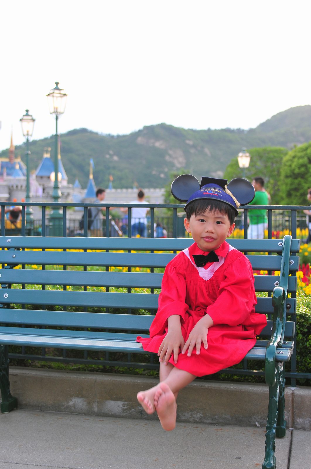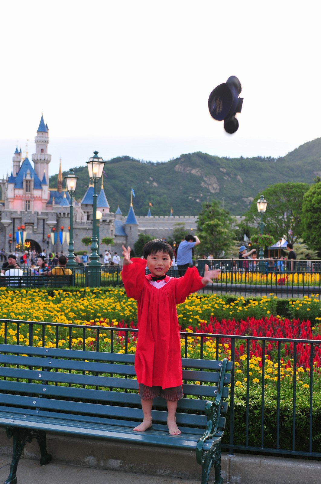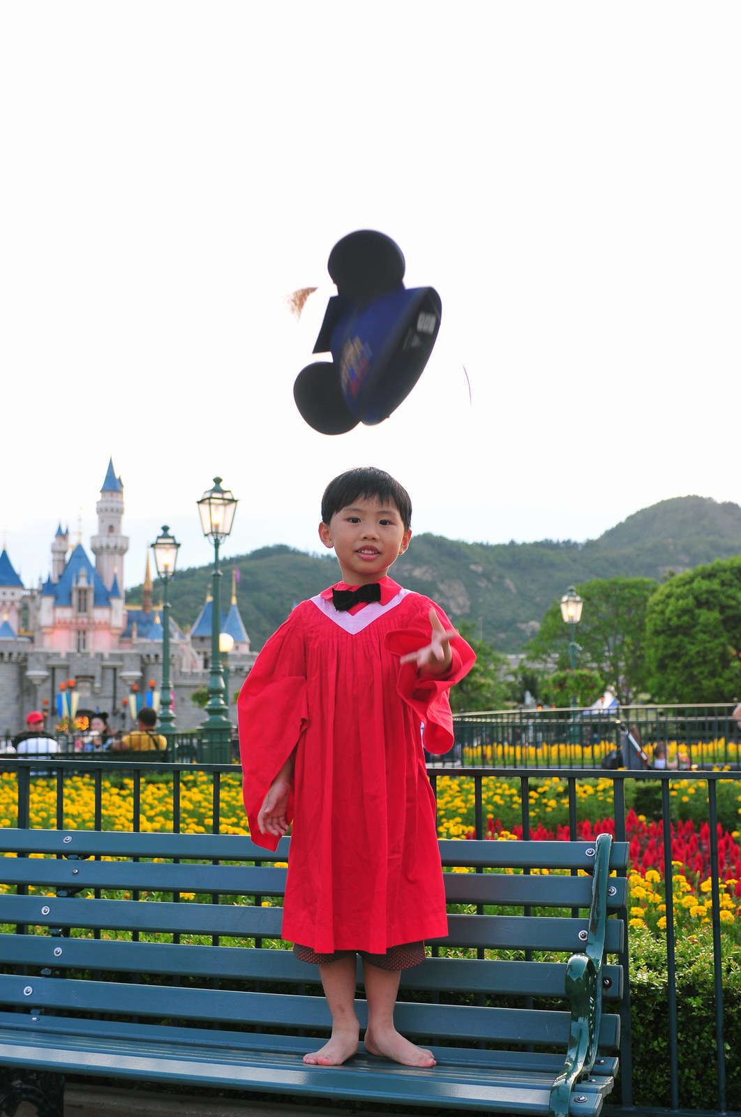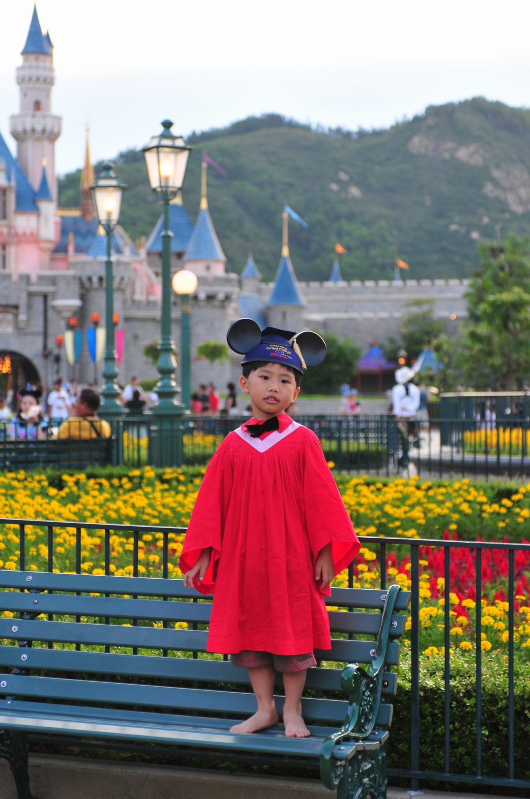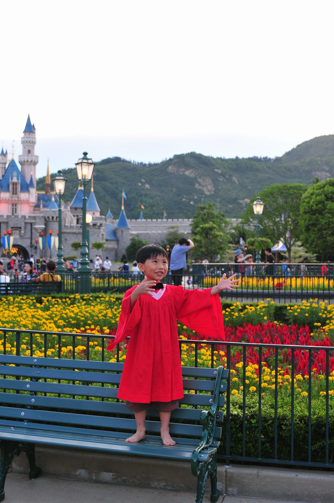 今天早上10時多,坐幼稚園的旅游巴約半小時就到達迪士尼酒店,由於幼稚園畢業班人數眾多,輪侯時間較長,期間正好讓小朋友借機玩耍嬉樂一翻,同學們三五成群或平時最熟悉的玩伴一起,或相互嬉戲、或齊唱畢業歌,場面歡樂感人,讓家長們都有了年輕的感覺。到了影相時間,各家庭的影相代表蜂擁至拍攝區,搶著有利位置輪侯捕足最佳鏡頭。各類設備神器皆有、手機、平板、傻瓜機、攝錄機、長短鏡頭單反齊齊現身,在這個人手一機全民皆攝影師的時代,你會發現就算手執專業單反相機的優越感會蕩然無存,長短焦的優勢也無處發揮,因為在你舉起相機瞄準對焦時,要不發現前景被那些趕在前方取近景的手機及偌大的平板遮蔽了鏡頭占了大部份景觀,更傷心的是你慶幸終於突圍而出找到一線空隙取得理想構圖按下快門時,冷不防一個手機或一個大平板就忽然伸到你的鏡頭前,搶去你的視線。所以,現在每遇到此場面,就會不期然有種失落感,懷念起以前智能設備還沒普及的那個年代,手執專業相機那份尊榮和便利,歎此風光已大江東去永不復還了。
