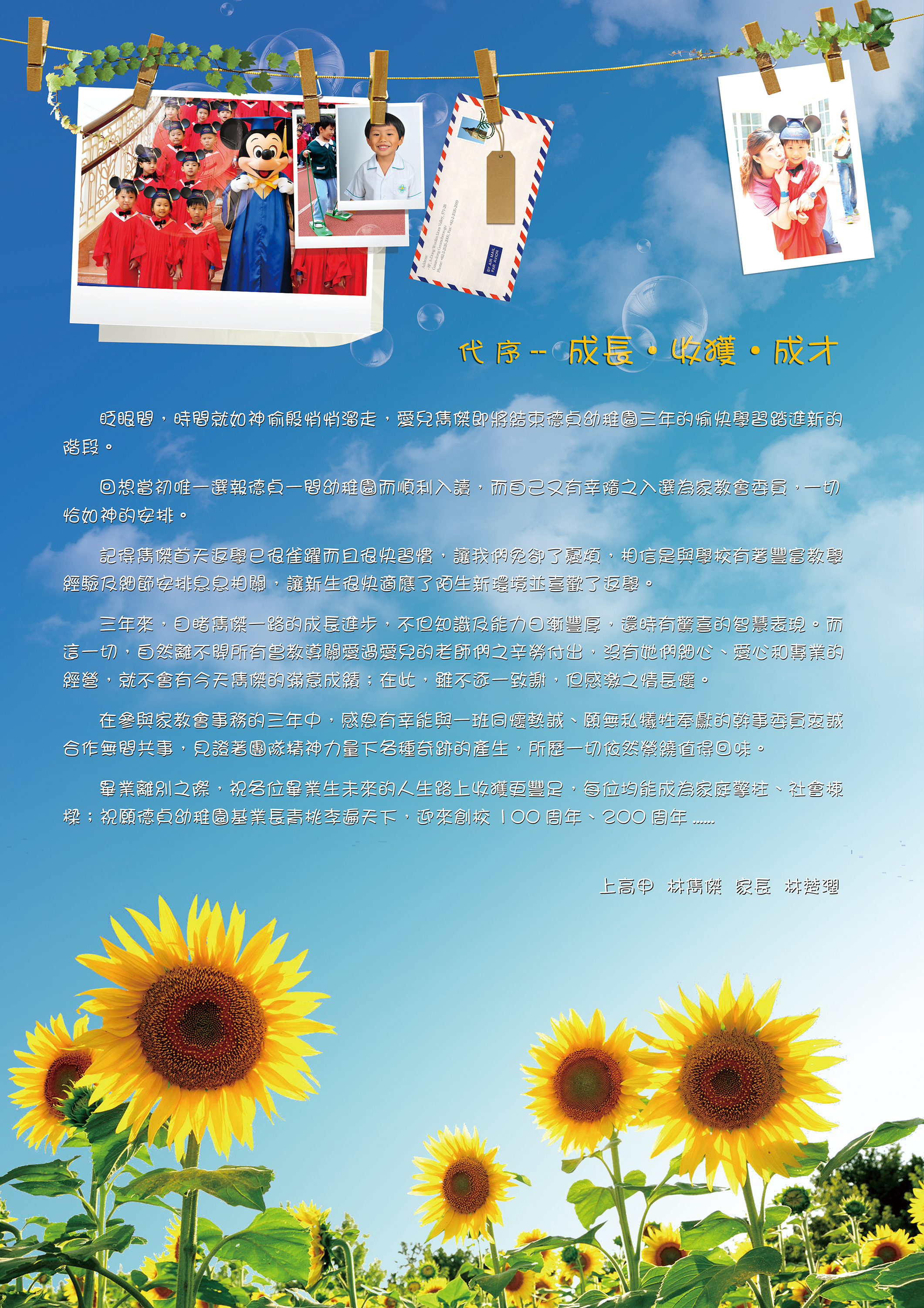 畢業離別之際,祝各位畢業生未來的人生路上收獲更豐足,人人成為家庭擎柱、社會棟樑;祝願德貞幼稚園基業長青桃李遍天下,迎來創校100周年、200周年……