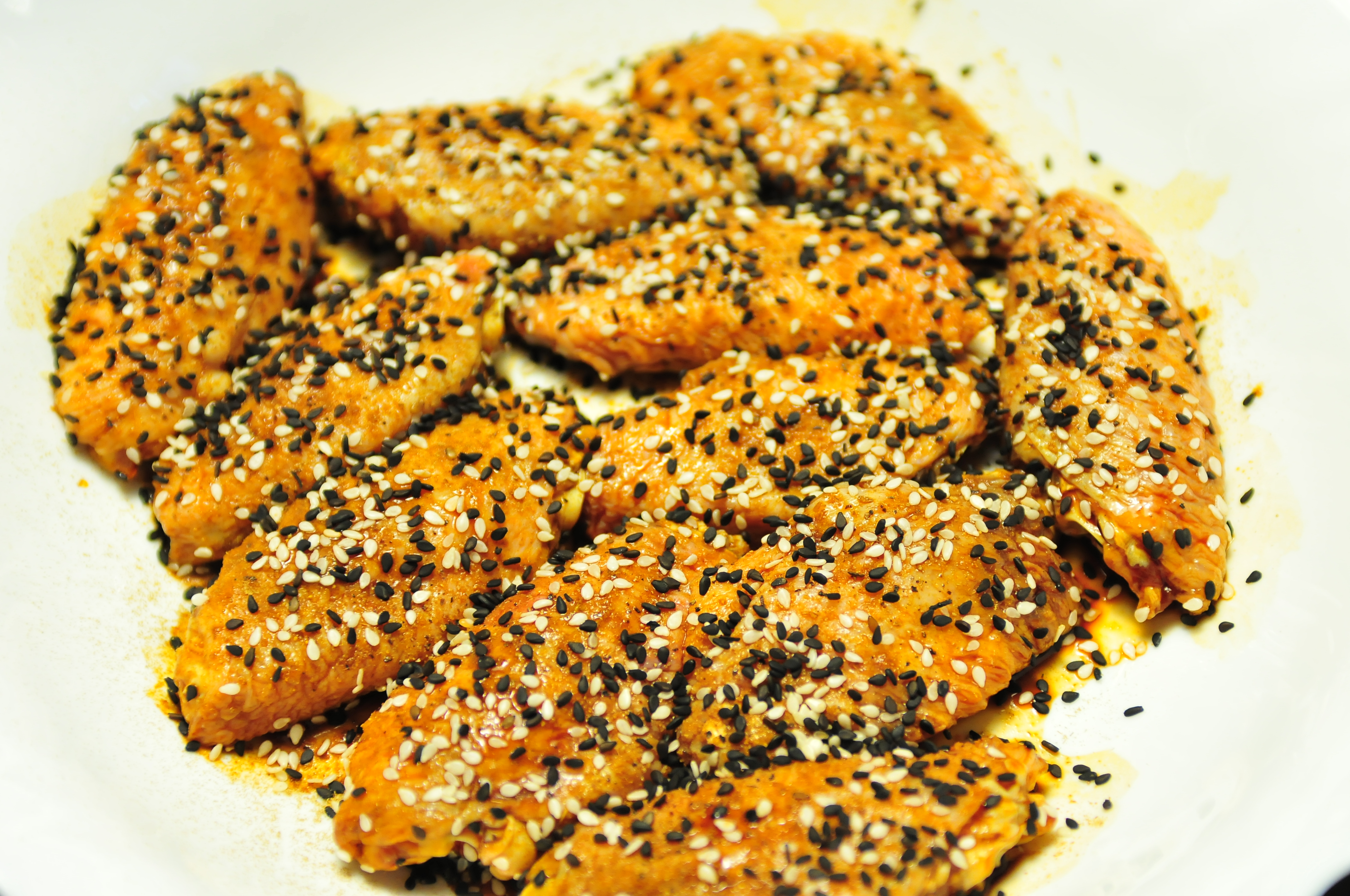 材料:主料當然是雞中翼啦,一般光波爐每次烤一磅就剛適宜;配料包括:蠔油約三茶匙、醬油約兩茶匙、老抽一茶匙;玫瑰露半茶匙、花雕酒兩至三茶匙,少許姜汁、半茶匙橄欖油;以上配料混合成醬,將洗淨瀝乾水份的雞翼放入密實袋中(雞翼想入味更好,可用小餐叉點刺幾下會更易入味),然後倒入混好的醬汁,搖均讓醬汁包裹所有雞翼,置入冰箱內醃三十分鐘以上(置12小時更入味);其他配料:孜然粉、香茅粉、黑椒碎粒、黑、白芝麻、紫菜絲。