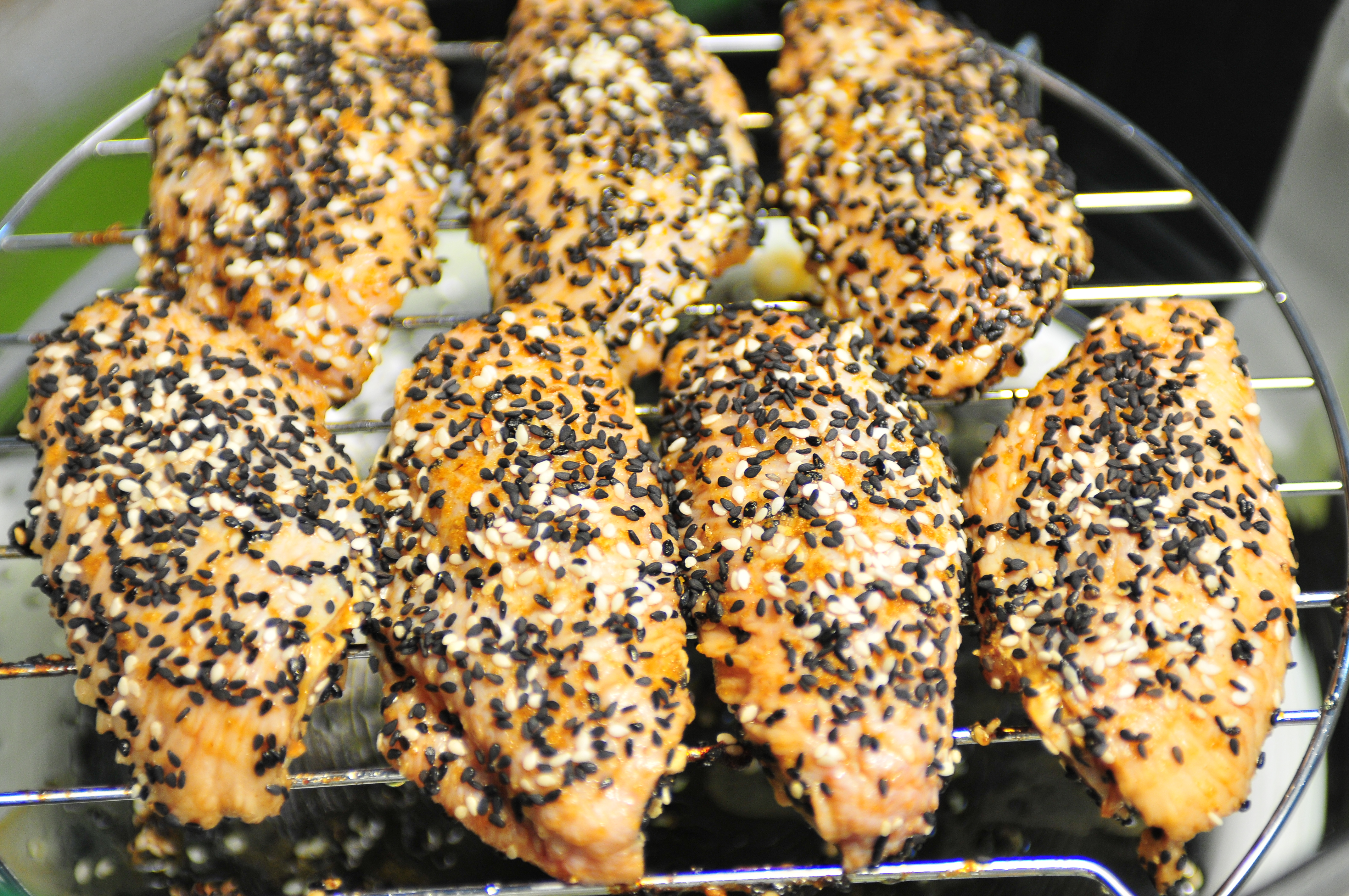 2、取出醃好的雞翼(背面朝上)平鋪好在烤架上(下面放置一大碟),灑上黑椒碎、孜然粉、香茅粉,然後是黑、白芝麻,排放好後放入爐中,重新設置時間為8-10分鐘;