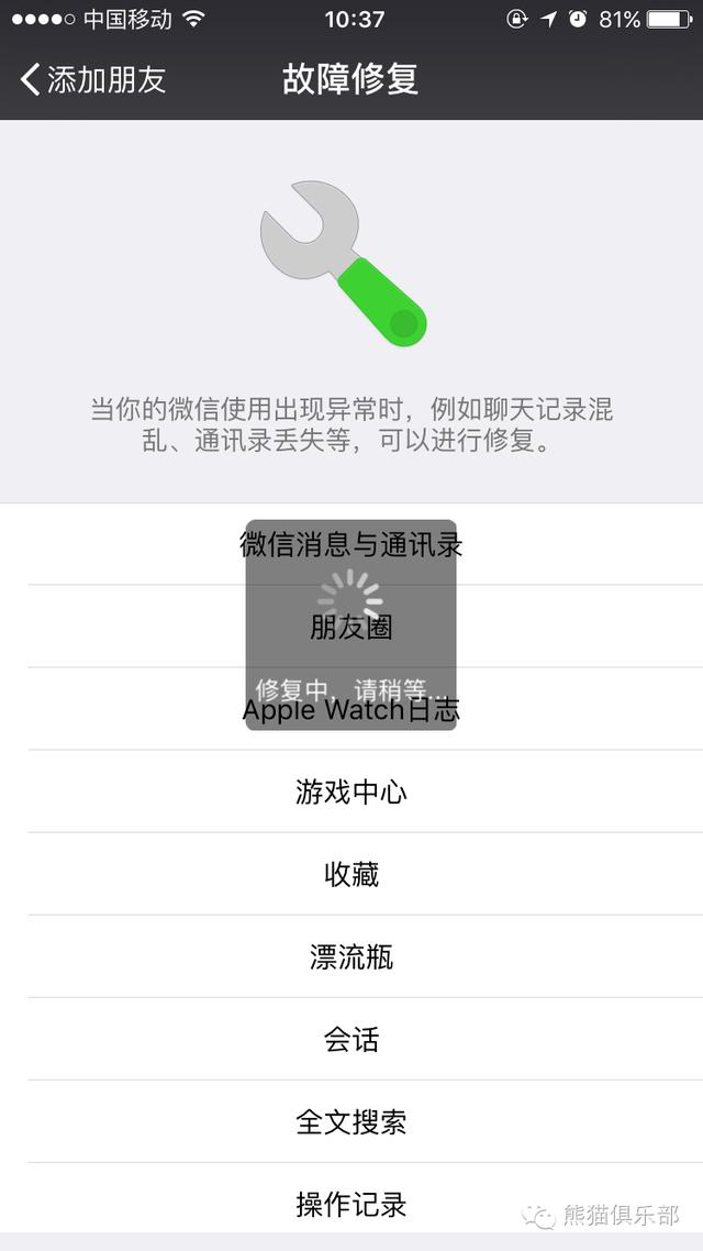 我们可以看到可以修复项目非常多,比如微信消息与通讯录,朋友圈,会话等等,这里以微信消息与通讯录为例,点击修复: