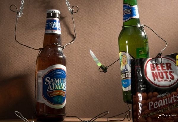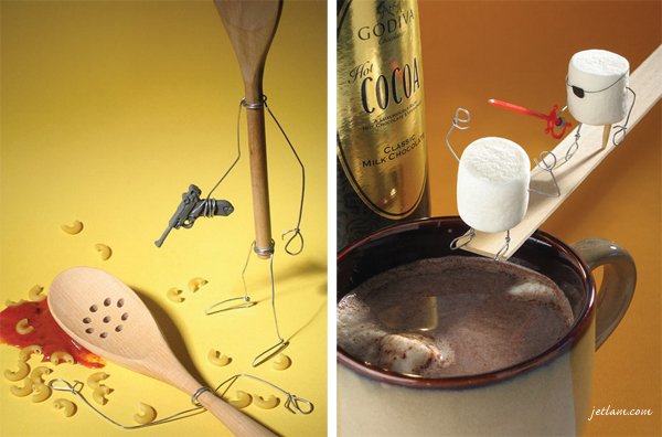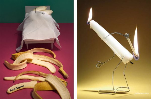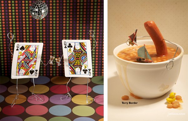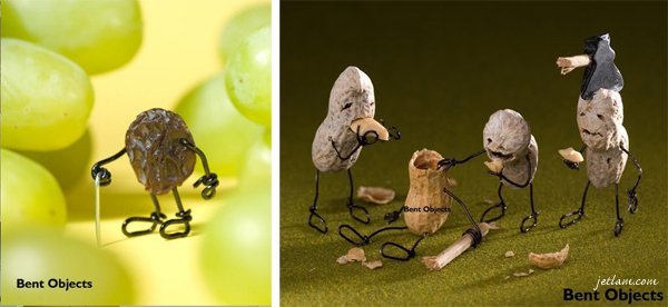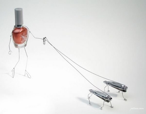 艺术家Terry Border就有此神來之手,他將酒瓶、指甲剪、食物、铁丝等平凡之物,通過巧妙編排,變成一個個有趣的畫面,讓人忍俊不住會心一笑。